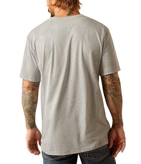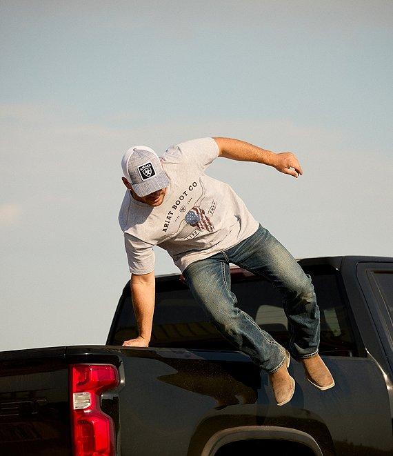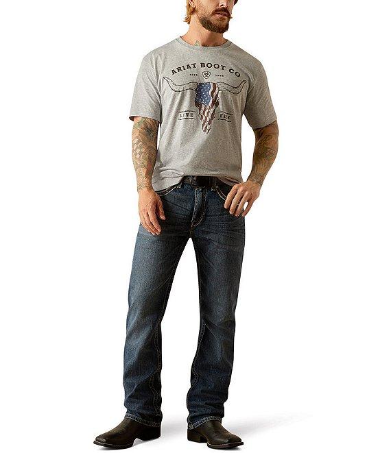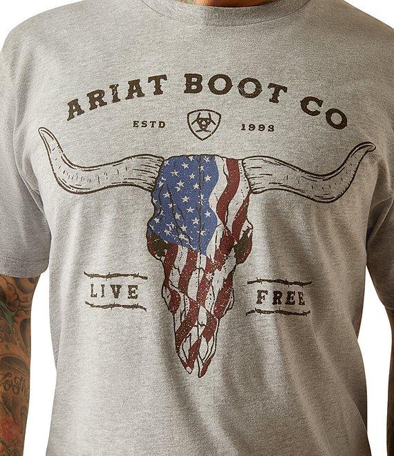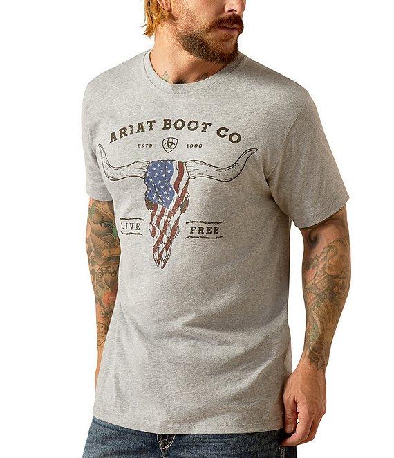 From Ariat, this T-shirt features: Crew neckline Short sleeves Americana patriotic Southwestern steer head graphic, “Ariat Boot Co.” logo, icon logo detail and other verbiage on the front Pullover construction Perfect for everyday wear Cotton Machine wash/tumble dry Imported.