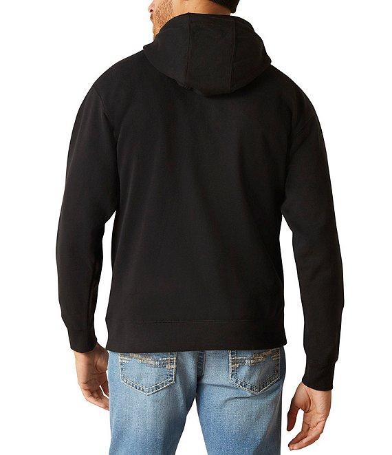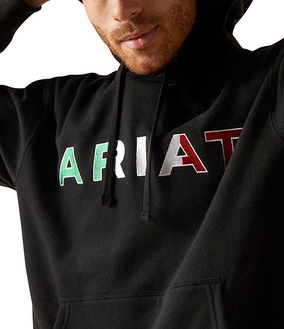 From Ariat, this hoodie features: Adjustable attached hood Long sleeves Pays homage to Mexican culture with a colorful brushed fleece “Ariat” logo Front kangaroo pocket Greater Arm Mobility™ for freedom of movement Ribbed hem Cotton/polyester fleece Machine wash/tumble dry Imported.