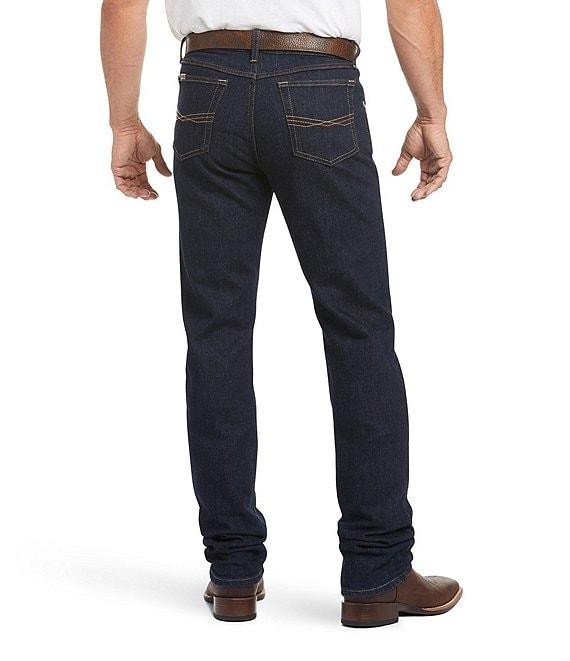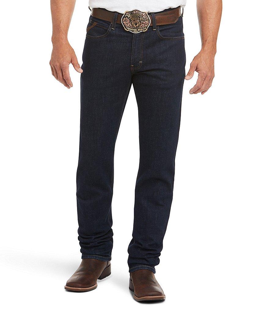 From Ariat, these jeans feature:12.75 oz ring-spun strecth denimSlim fitting through seat and thighSits just below the waistStackable straight legDark washNo-rub comfort inseamsAnchored belt loopsHeavy-duty zippers and hardwareExtra deep front pockets99% cotton, 1% spandexMachine wash coldImported.