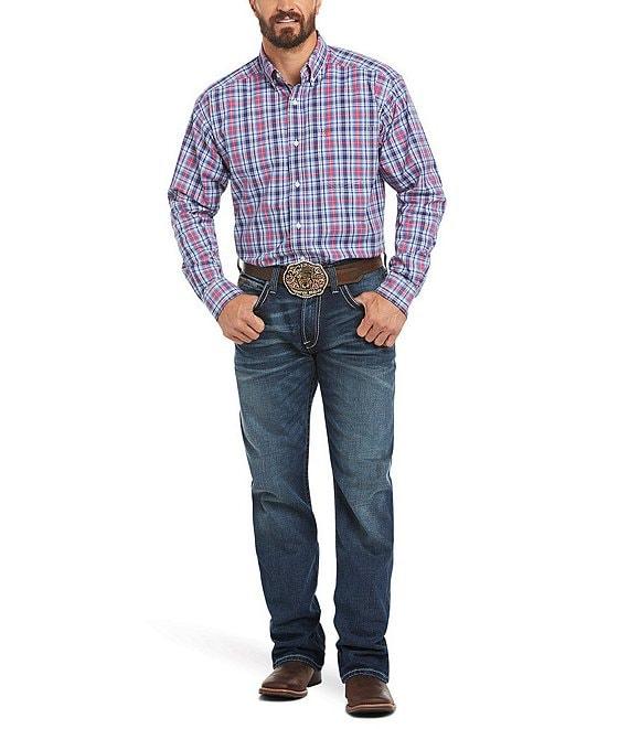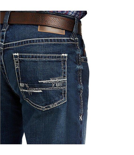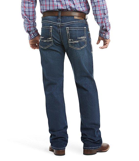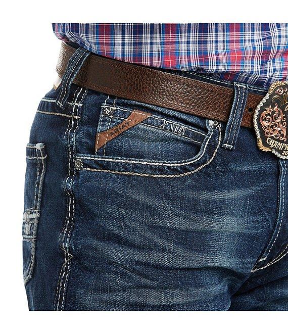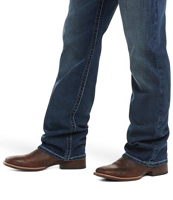 From Ariat, these jeans feature: 13 oz ring-spun stretch denim Anchored belt loops No-rub comfort inseam Heavy-duty zippers and hardware Extra deep front pockets Relaxed through the waist, hip and thigh Sits lower on the waist Classic boot cut Cotton/spandex Machine wash cold/tumble dry Imported.
