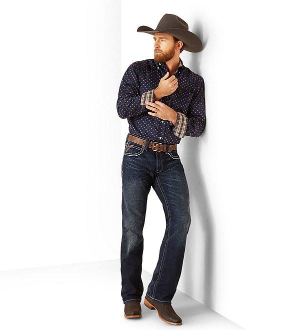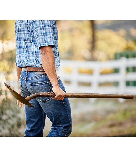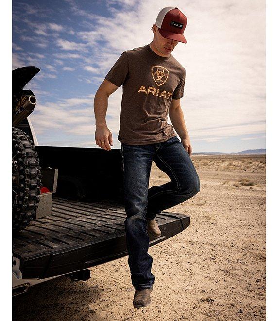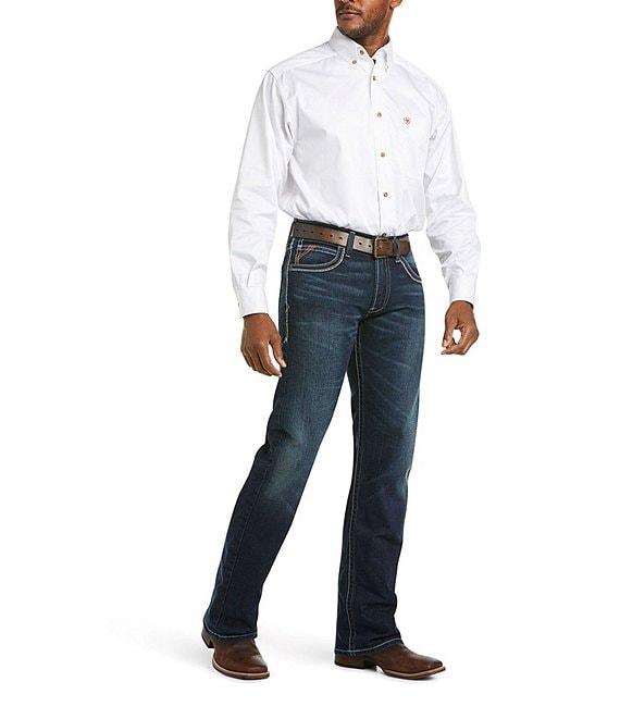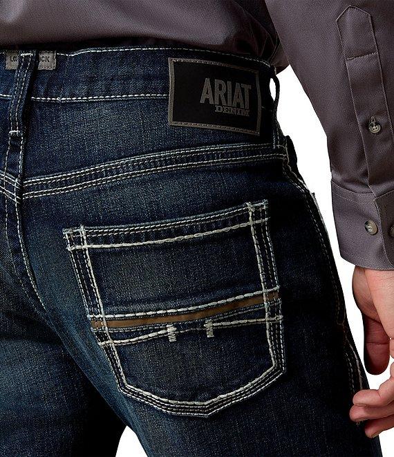 From Ariat, these jeans feature: 13.5 oz ring-spun TekStretch denim Loop Lock® reinforced rear belt loop No-rub comfort inseam Anchored belt loops Heavy-duty zippers and hardware Extra deep front pockets Straight through seat and thigh Sits below the waist Straight leg opening Cotton/spandex Machine wash cold/tumble dry Imported.