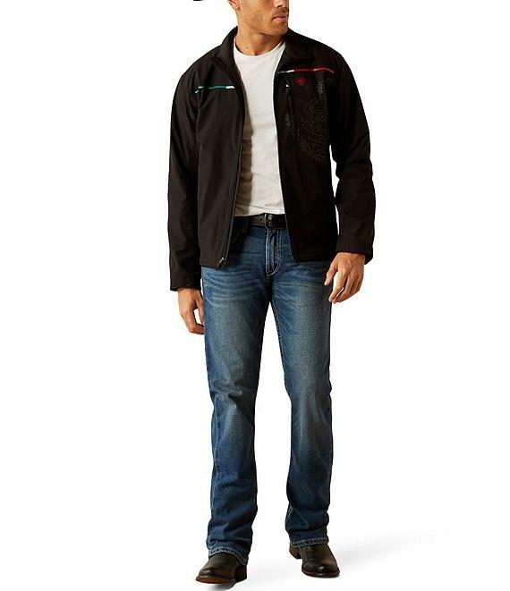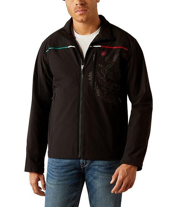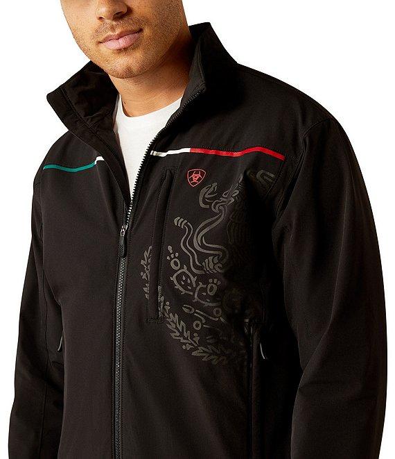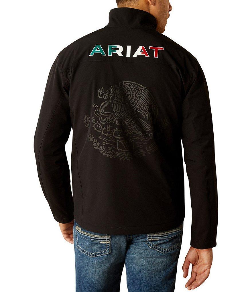 From Ariat, this jacket features: Collar Long sleeves Zip-front closure Ariat icon logo detail on the front "Ariat" logo block lettering on the back Subtle Mexican flag details add a bit of patriotic flair Three-layer stretch shell construction Wind-and-water resistant Breathable design Comfy lining Lightweight stretch insulation Microsoft backing helps retain heat Nylon/elastane Machine wash/line dry Imported.