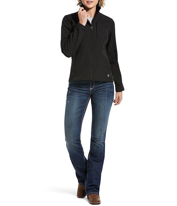 From Ariat, this jacket features: Embossed stretch softshell fabrication Stand collar Long sleeves Zippered hand pockets Interior concealed pocket Fleece lining Zip front closure Approx. length 25" Polyester/spandex Machine wash cold Imported.