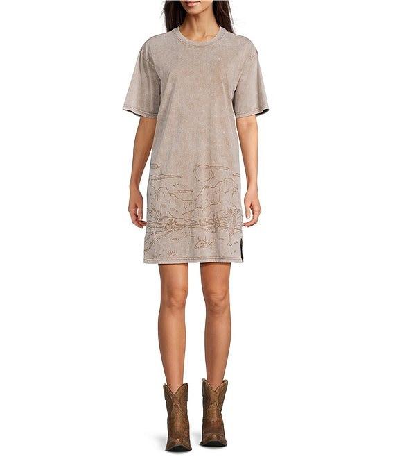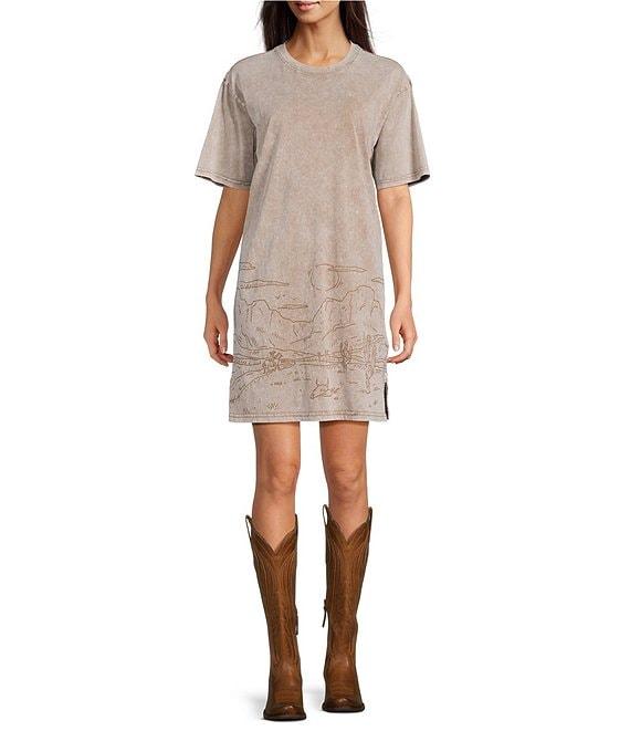From Ariat, this dress features:Graphic printCotton fabricationMineral washCrew necklineShort sleevesSide slitsPullover constructionCottonMachine wash cold/line dryImported.