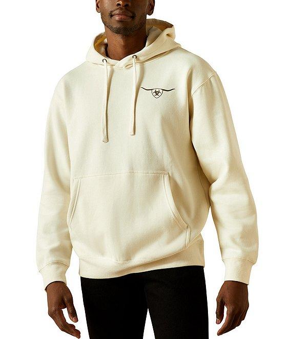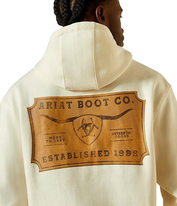 From Ariat, this hoodie features: Attached hood Long sleeves Steerhead graphic on the front Front kangaroo pocket Ariat Boot Co. logo, steerhead graphic, and other verbiage on the back Pullover construction Ultimate throw-on-and-go layer Crafted from soft, cozy fleece Cotton/polyester fleece Machine wash/tumble dry Imported.