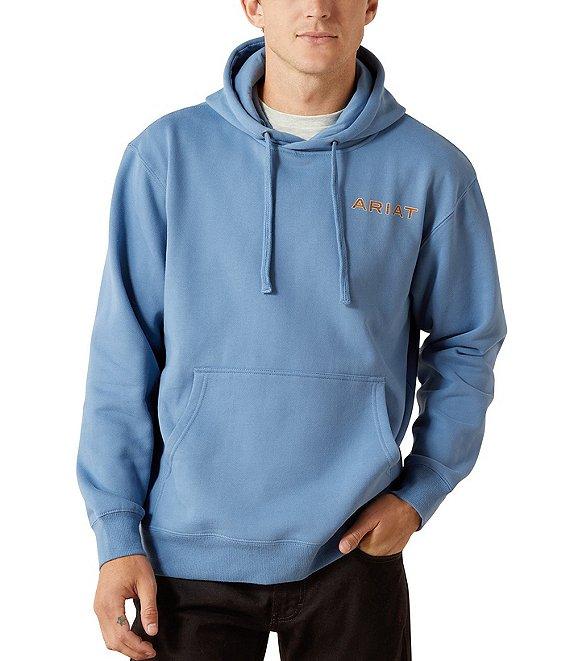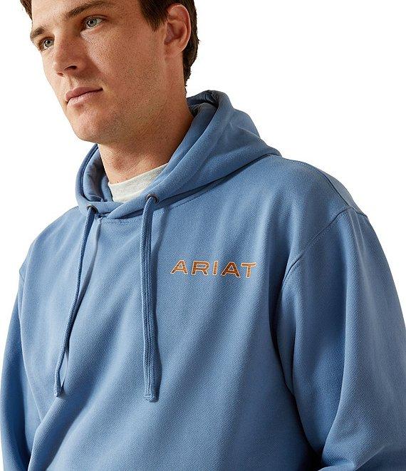 From Ariat, this hoodie features: Ultra-soft and extremely comfortable fleece fabric Attached hood with drawstring "Ariat' logo on the chest Large graphic with center "Ariat" logo on the back Roomy kangaroo pocket Pullover construction Perfect for everyday wear with a familiar, easy fit Ultra-soft and extremely comfortable cotton/polyester fleece Machine wash/tumble dry Imported.
