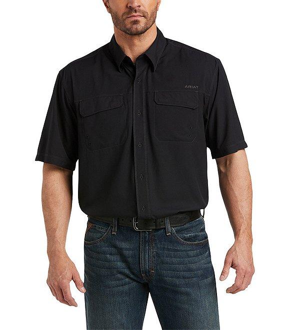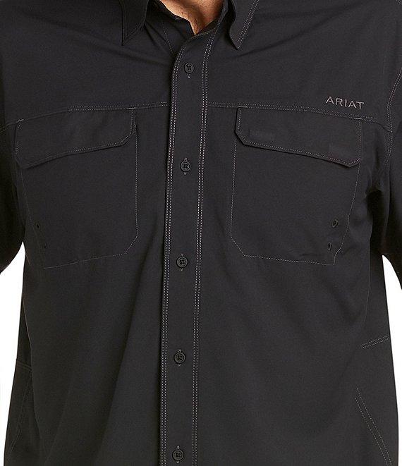From Ariat, this shirt features: hidden button-down collar short sleeves button front closure greater Arm Mobility seam construction for maximum range of motion double front Velcro® pockets hidden microfiber lens cloth on shirt tail breathable mesh back fabric finish inhibits the growth of bacterial odors VentTEK™ technology features body mapping to enable air flow and regulate body temperature Sun Protection Fabric™ with UPF rating of 50 provides protection from ultraviolet rays Moisture Movement Technology™ wicks moisture away from the skin polyester machine wash/tumble dry Imported.