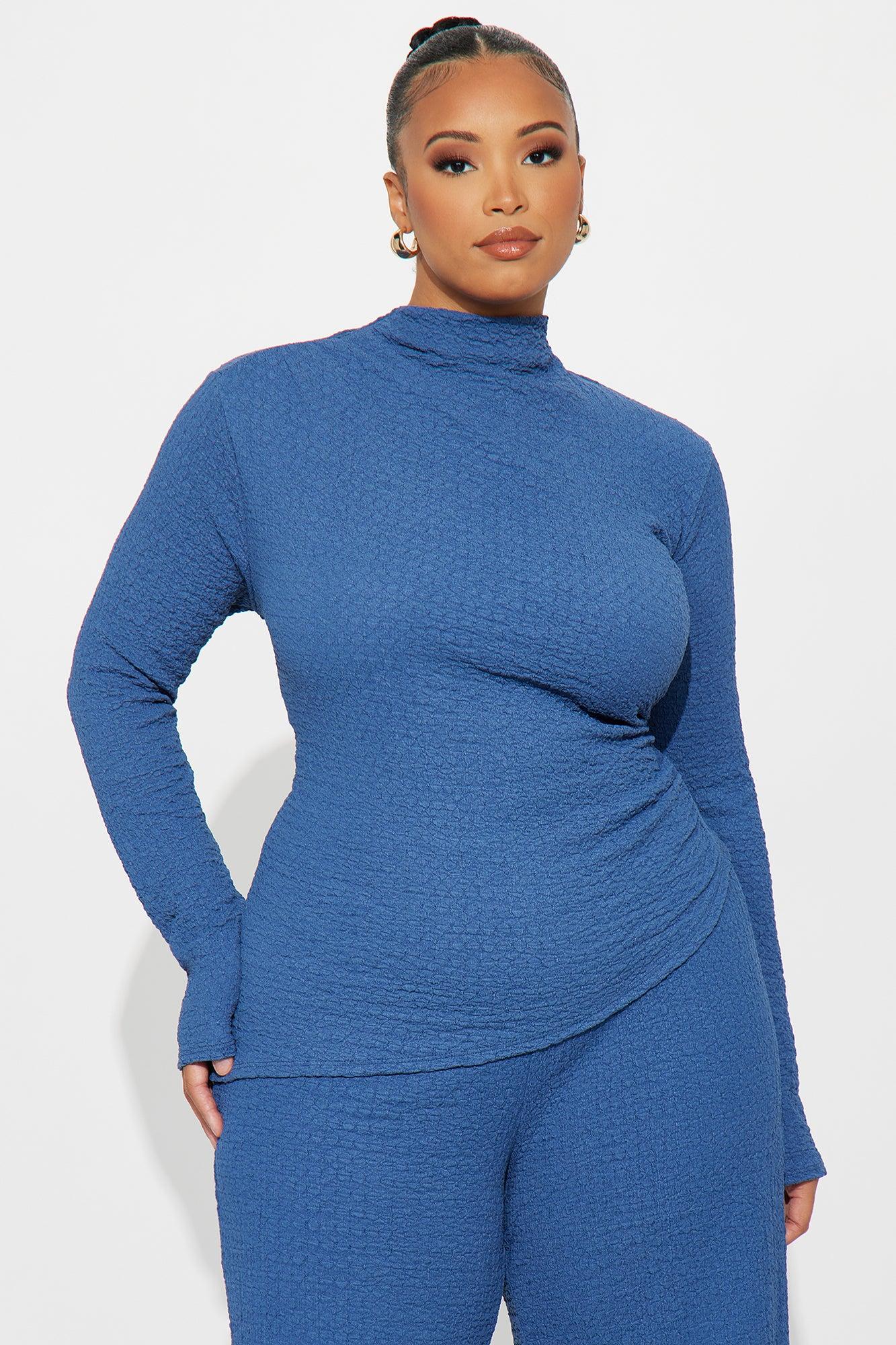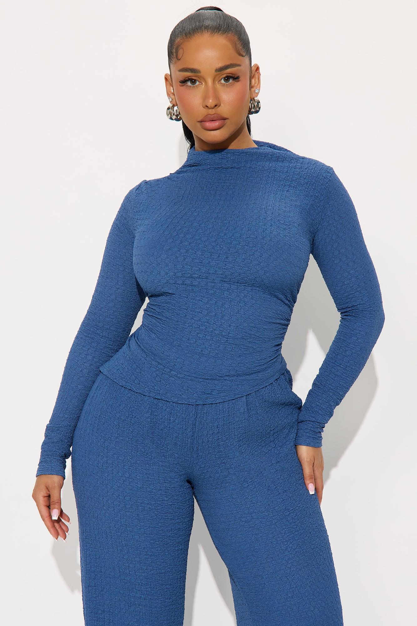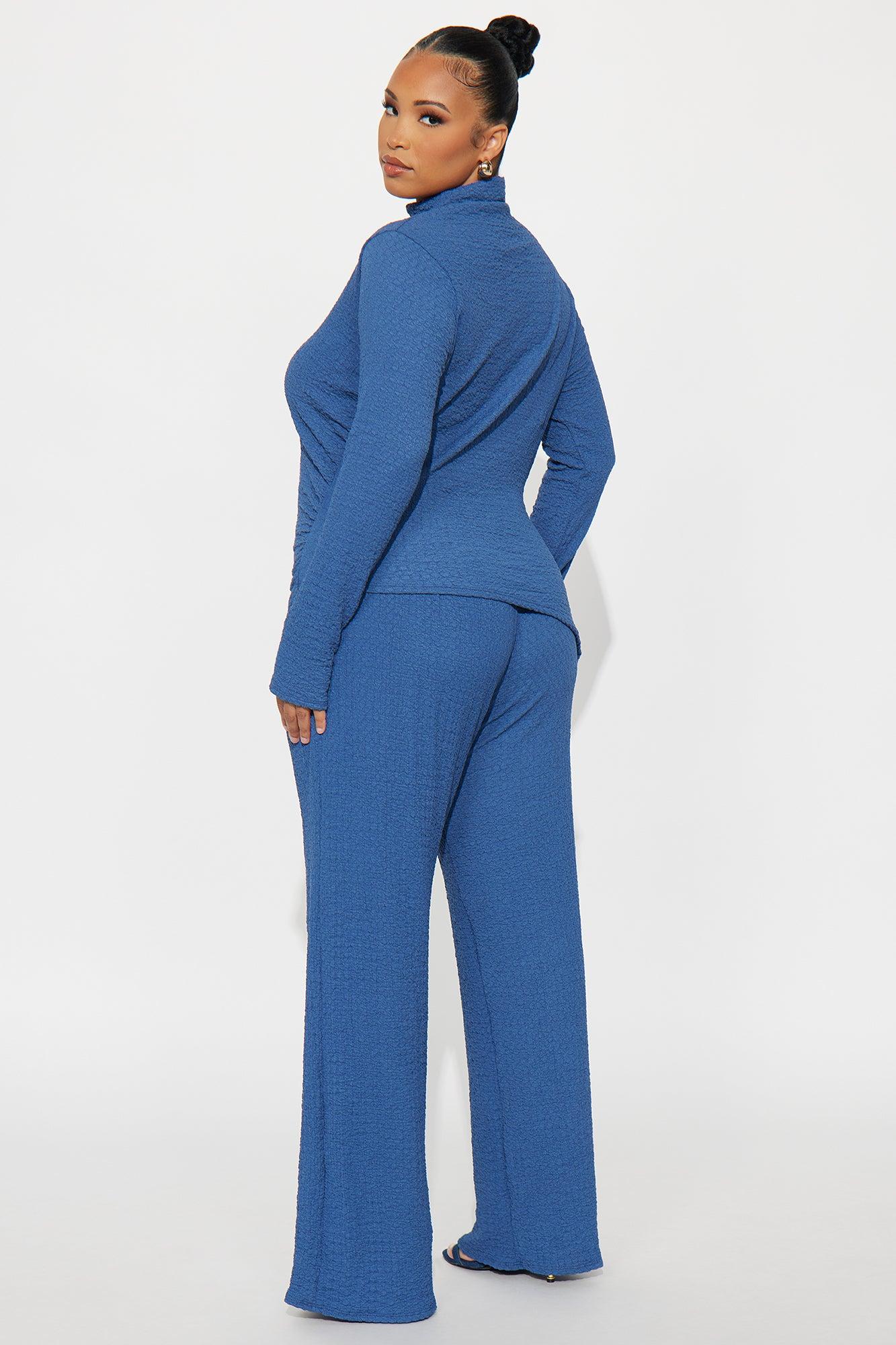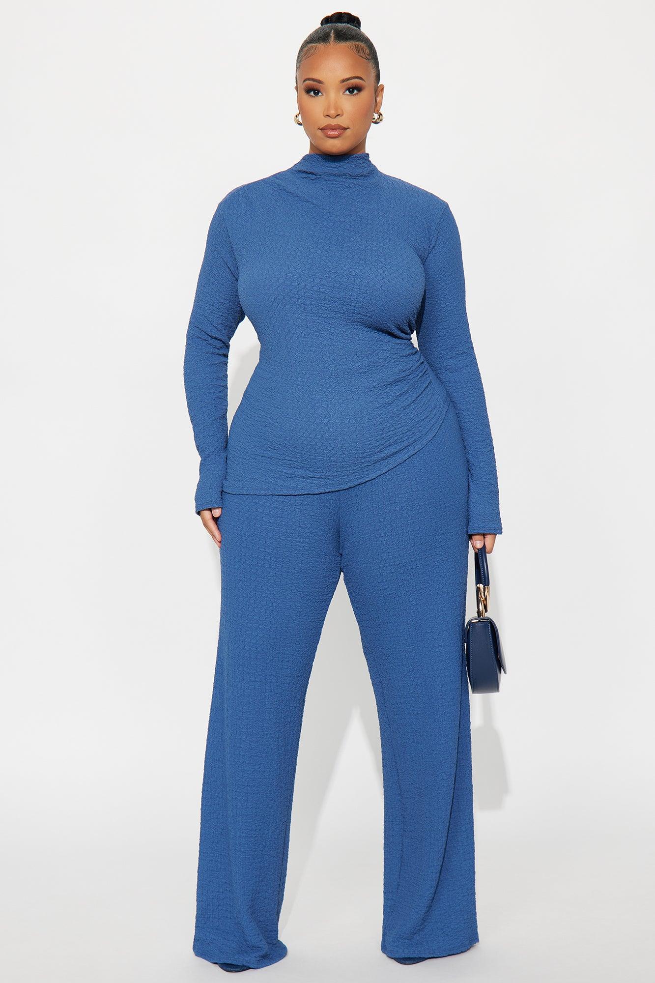 Available In Denim And Mauve. 2 Piece Ensemble Long Sleeve Top And Wide Leg Pant Set Stretch 33" Inseam Elastic Waistband 97% Polyester 3% Spandex Imported