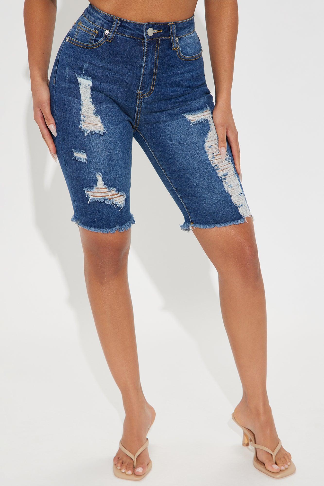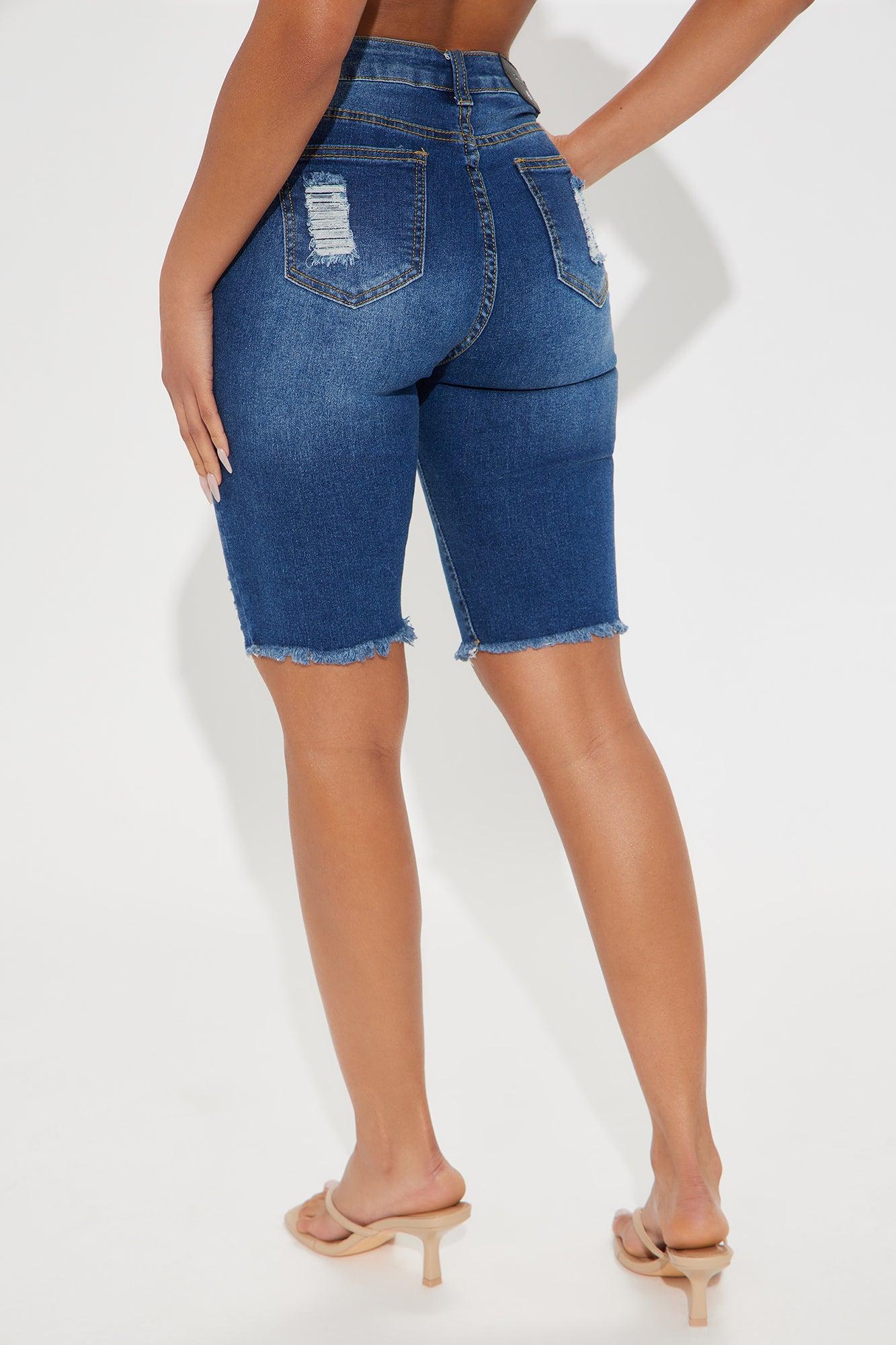 Available In Dark Wash, Light Wash, And Medium Wash. Denim Bermuda Short 5 Pocket Distressed Fray Hem 10.5” High Rise 10” Inseam Medium Stretch Disclaimer: Due To The Specialized Wash & Distressing Process, Each Garment Is Unique. 75% Cotton 23% Polyester 2% Spandex Imported