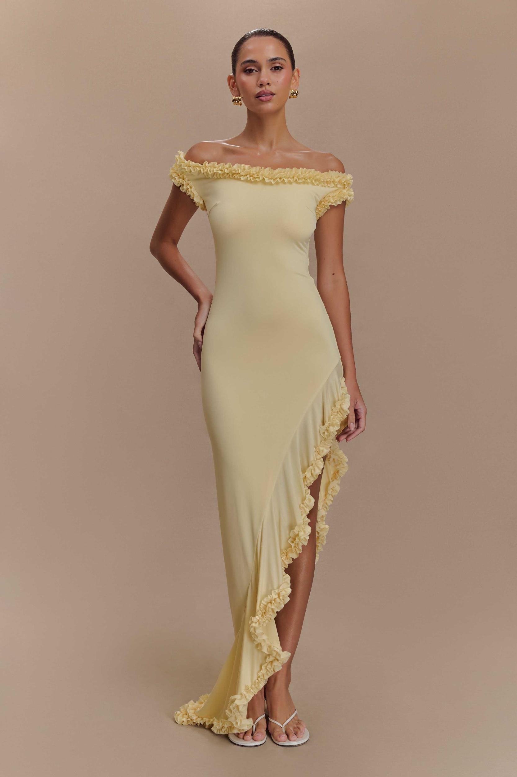 All ruffled up.Step into sophistication with the ARIELLE Off Shoulder Ruffle Midi Dress, a stunning blend of elegance and charm. With its off-the-shoulder design and asymmetrical hem, this dress exudes contemporary sophistication. The frill hem adds a playful and dynamic touch, while the flower appliqué neckline and hem bring a delicate and feminine flair. Designed with a bodycon silhouette, it offers a flattering fit for any occasion. Elevate your ensemble with the Arielle Off Shoulder Ruffle Midi Dress, where modern style meets timeless grace for a captivating look.