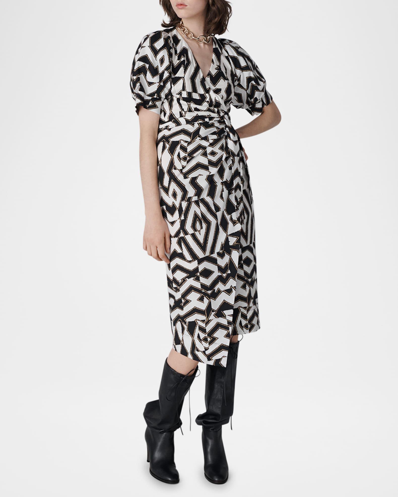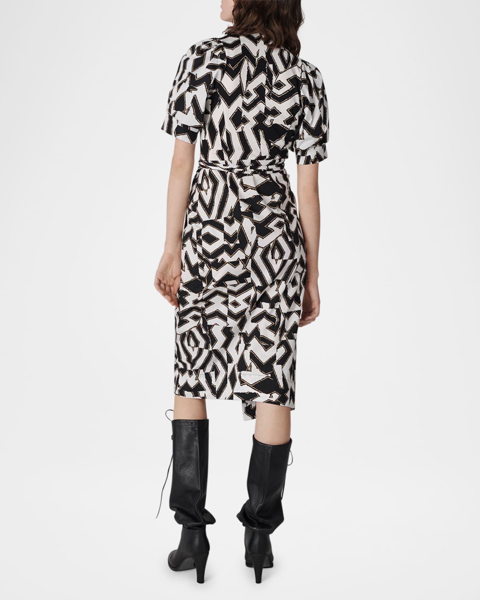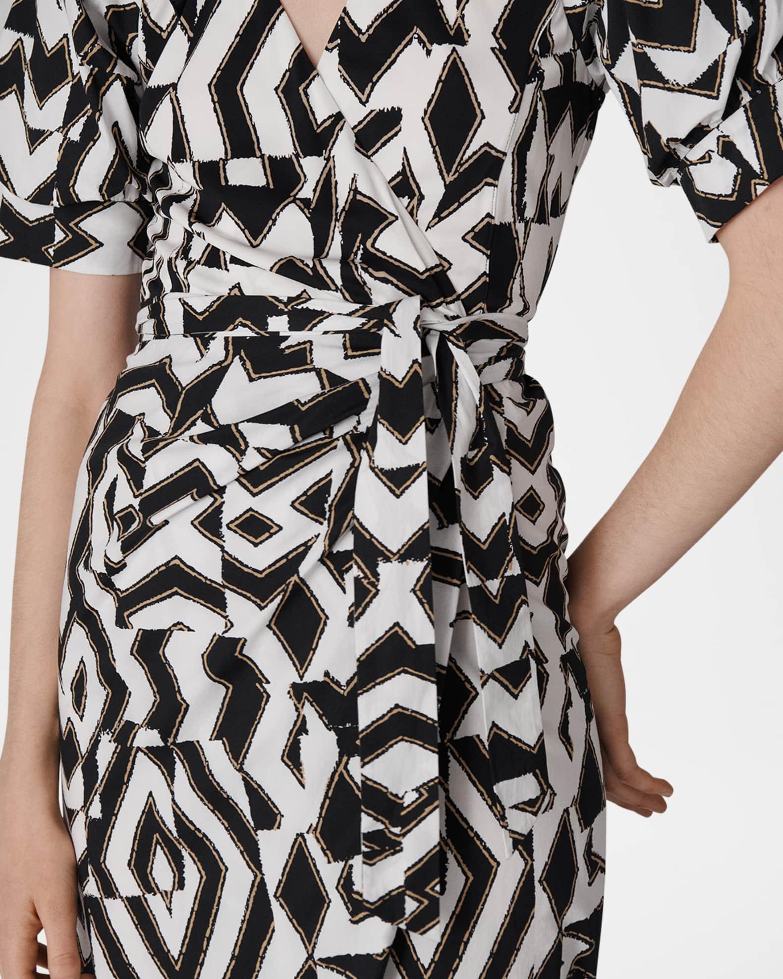 Diane von Furstenberg "Arina" midi wrap dress features an abstract geometric print Approx. 45.5"L from shoulders to hem Surplice neckline; wrap front Short puff sleeves Waist self-tie Hem falls below the knee Column silhouette Viscose Imported