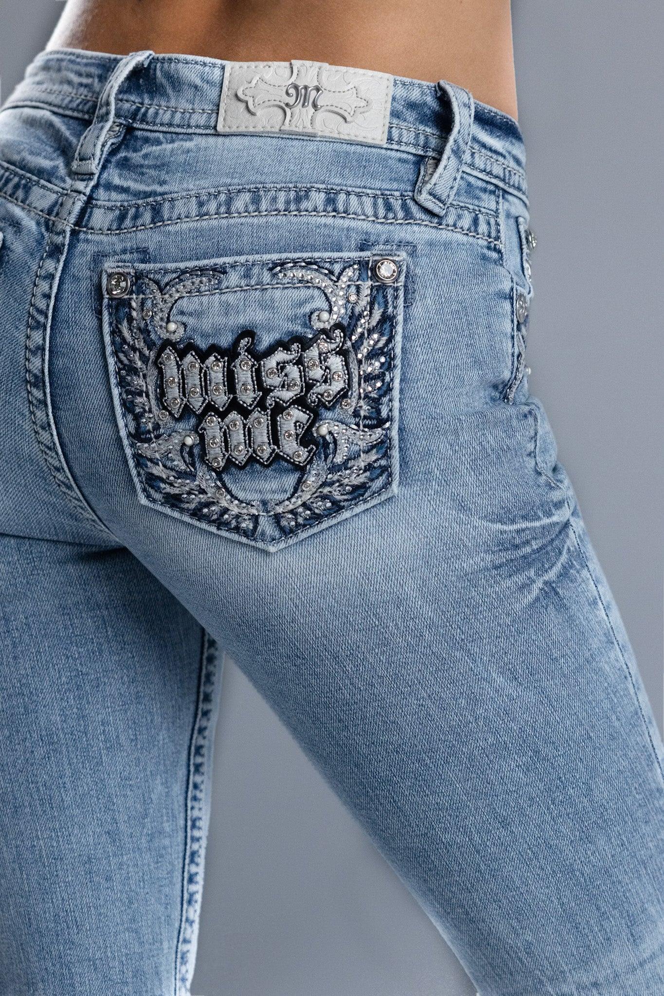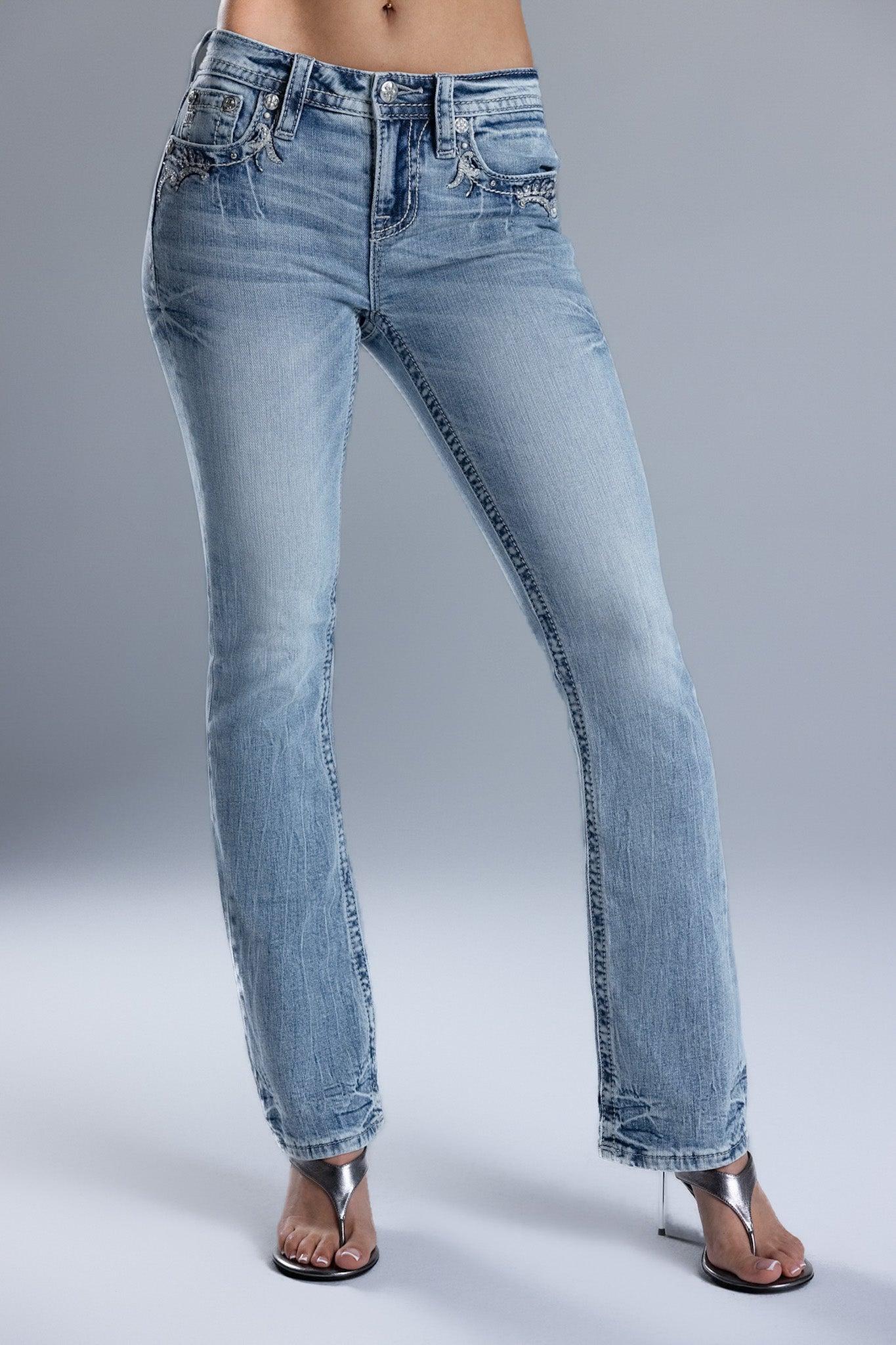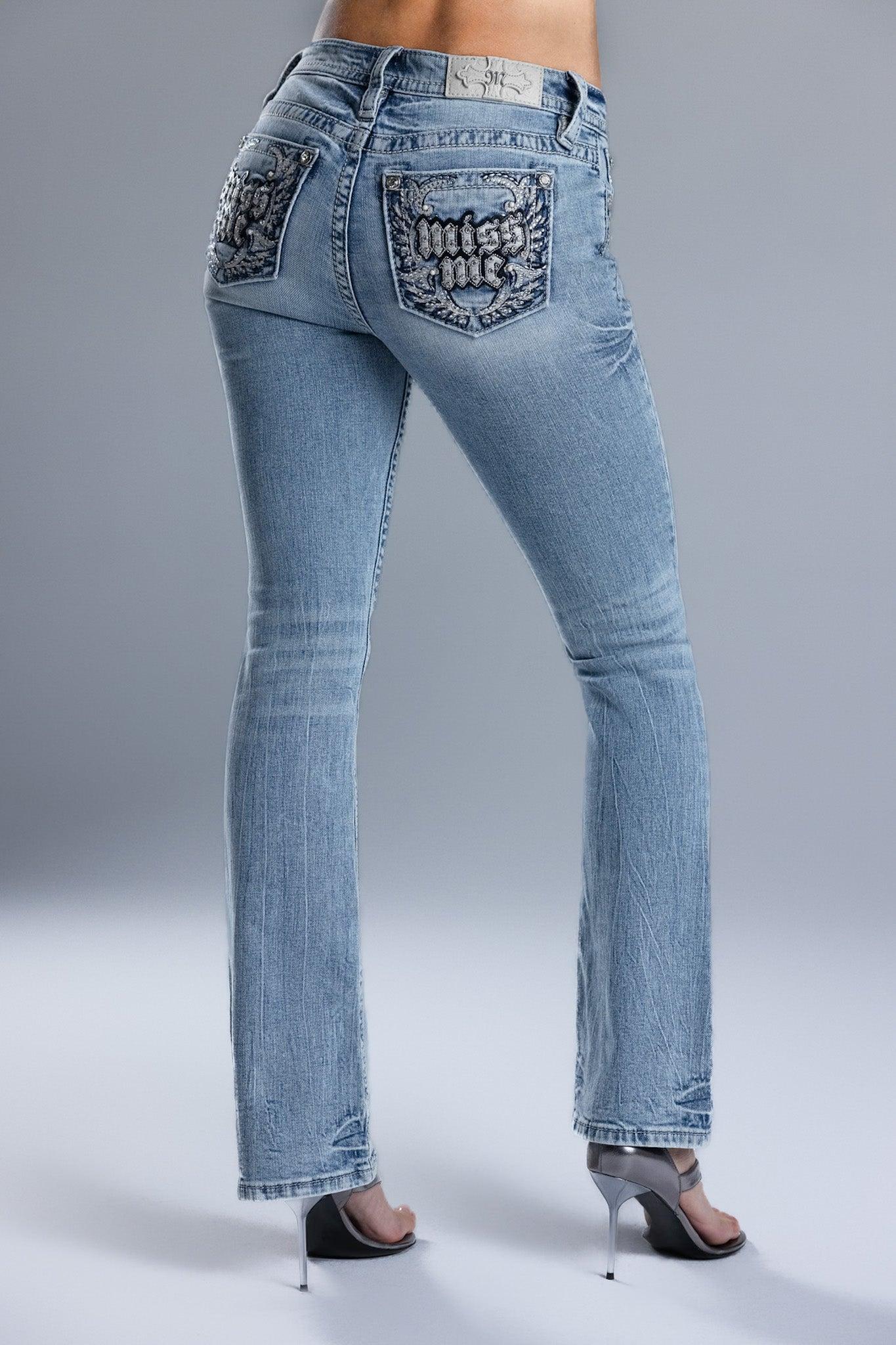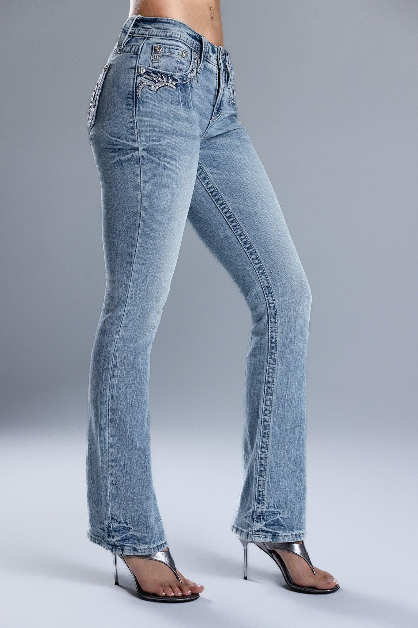Washed finish, mid-rise bootcut jeans- Embroidered leather appliqué script branding- Stitched feather filigree detailing- Faux pearl and rhinestone rivet accents- Embossed white leather cross Miss Me brand patch- Whiskering details- 5-pocket design Model is wearing size: 25 Model Measurements:Height: 5'9"Bust: 34"Waist: 26"Hips: 35" Fabric Content: 99% Cotton, 1 % Elastane Care: Gentle machine wash inside-out with like colors in cold water. Tumble dry low. Style No. M9631BS-L363, M9631BV-L363
