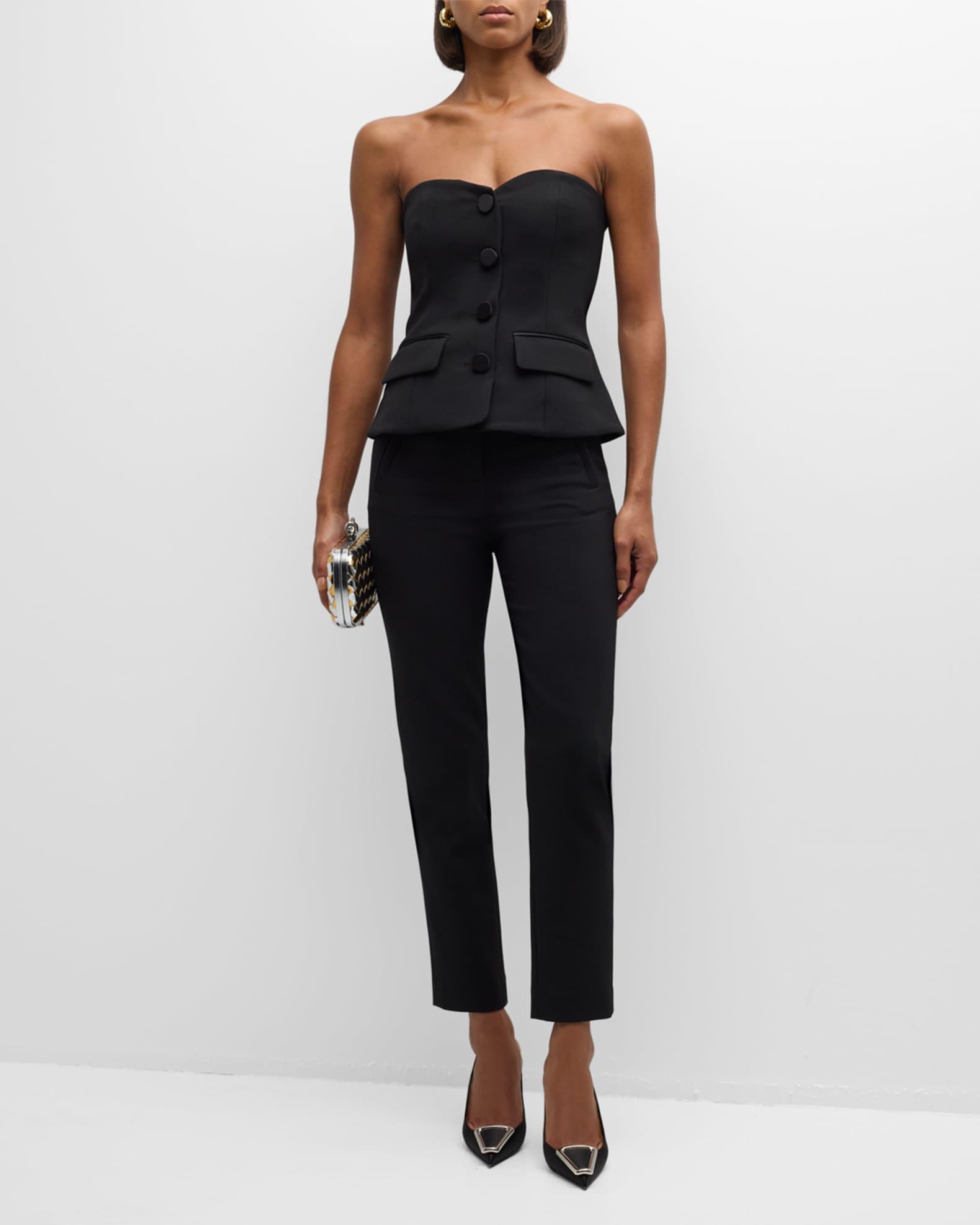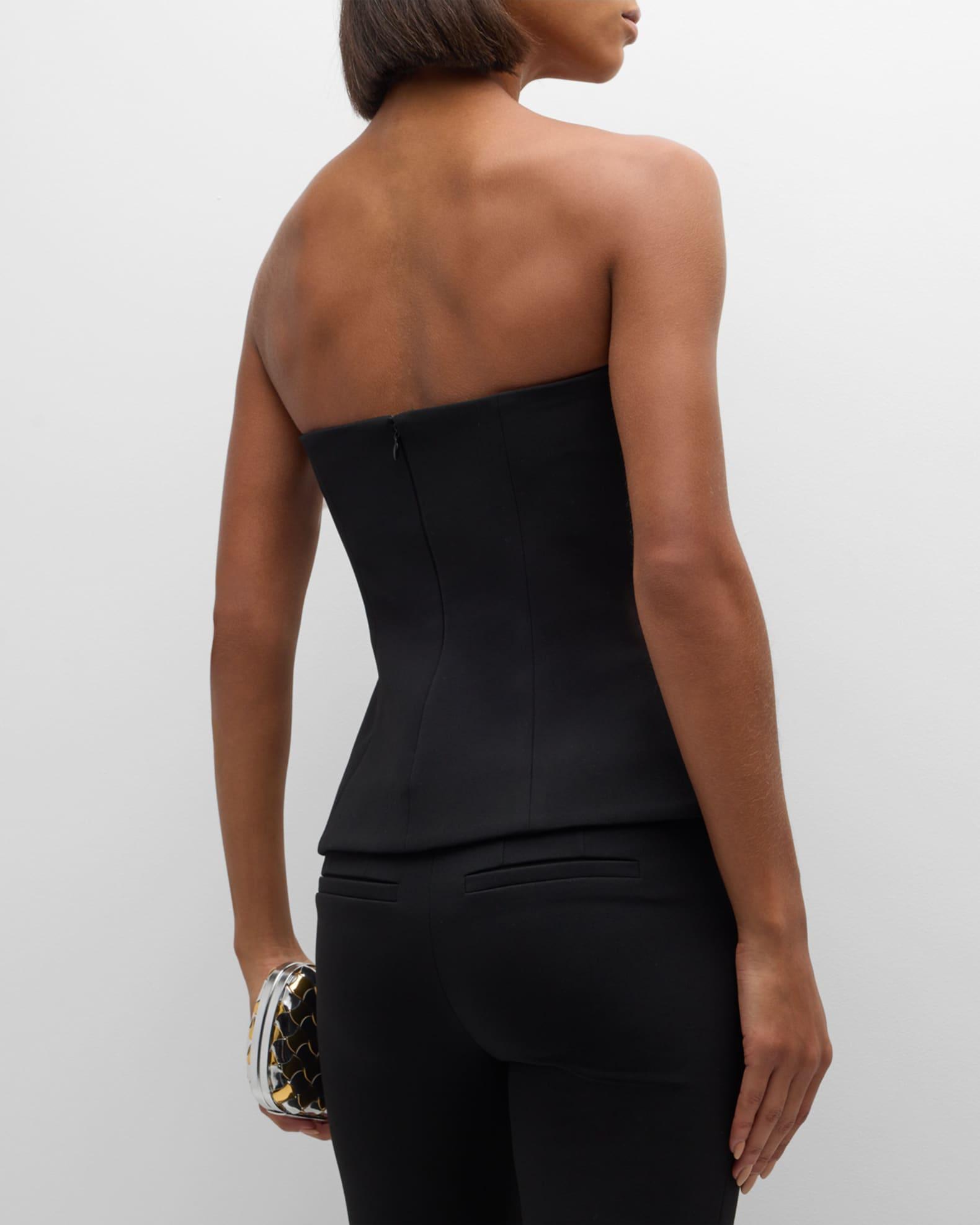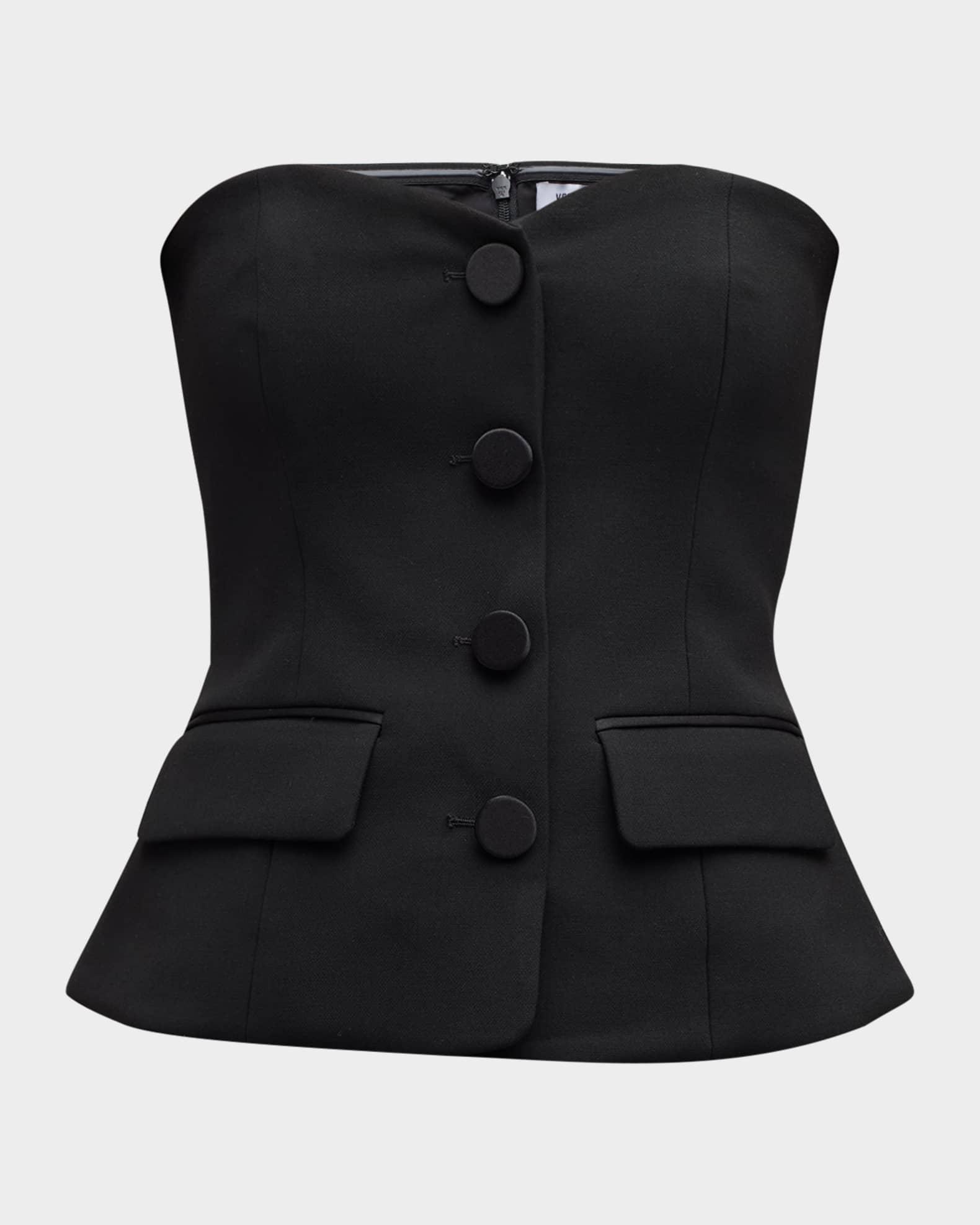 Veronica Beard "Arlette" strapless bustier top featuring covered buttons Sweetheart neckline Sleeveless Faux hip pockets Fitted silhouette Hem sits at the hip Invisible back zip Polyester/viscose/cotton Lining: Polyester Dry clean Made in USA from imported materials Model is 5'10"/177cm.