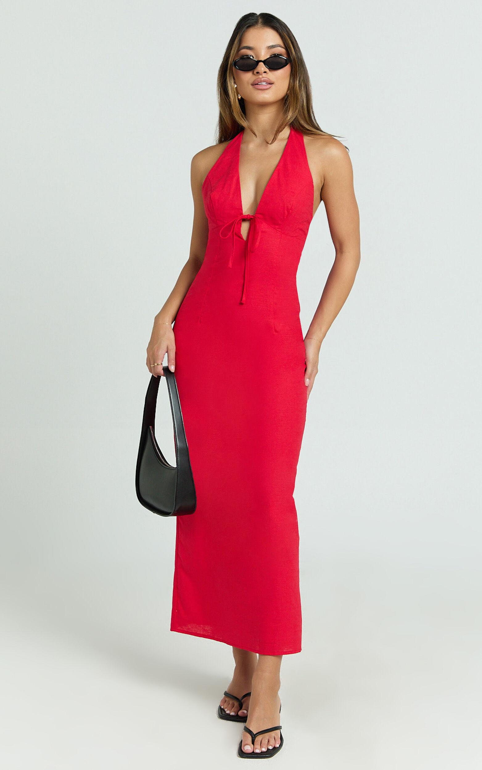 Arlette Midi Dress - Strappy V Neck Under Bust Gathered Tie Front Bias Slip Skirt Dress in Red
