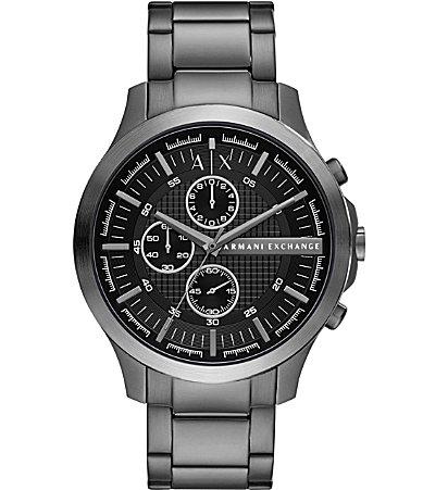From Armani Exchange, the Mens Hampton Quartz Chronograph Gunmetal Stainless Steel Bracelet Watch features: Gunmetal stainless steel bracelet and caseBlack textured dial2 pusher fold-over clasp closureQuartz chronograph movementStrap width approx. 22mmCase size approx. 46mmCase thickness approx. 10mmInner circumference approx.: 200 +/- 5mmWater resistance: 5 ATMImported.