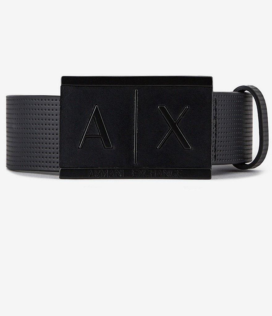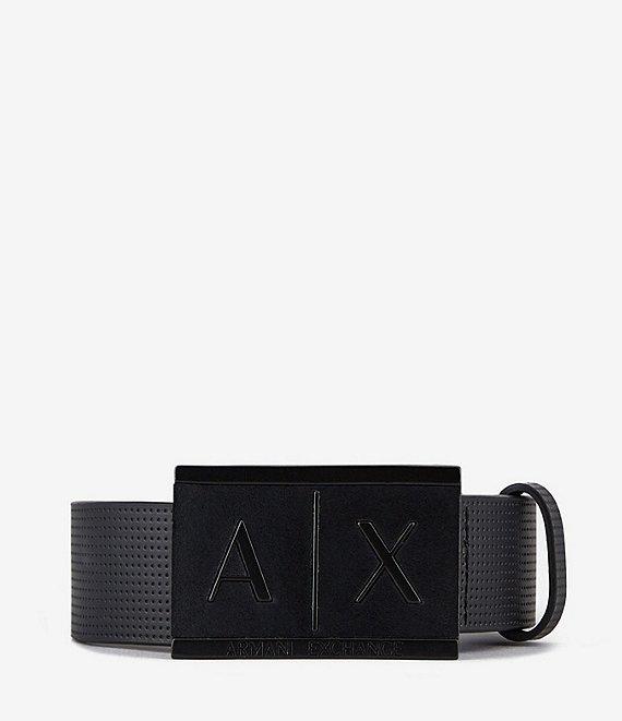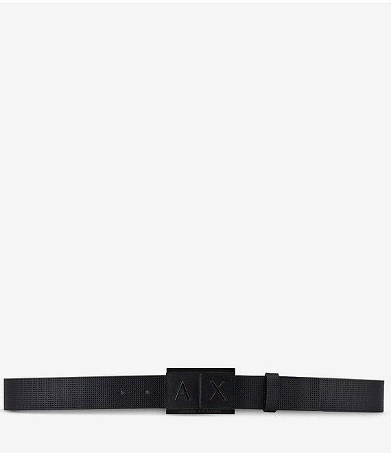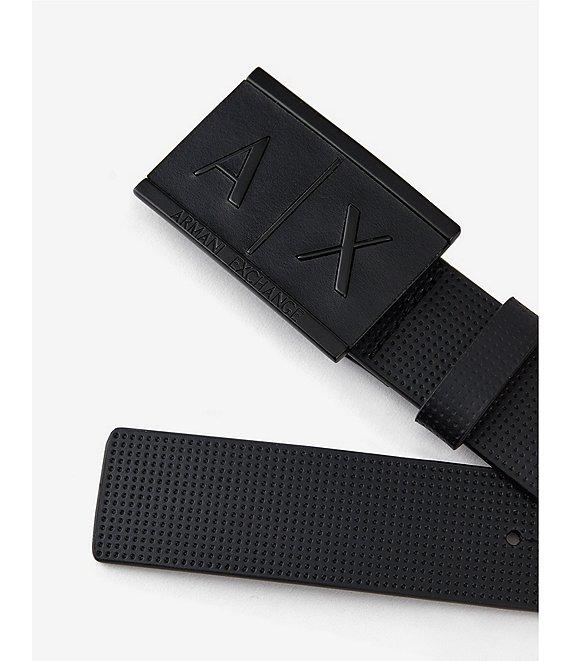 From The Armani Exchange, this belt features: Approx. 1.4" width metal hardware outside coating: polyurethane A/X Armani Exchange logo on front Bovine leather spot clean Imported. Suggested belt size: Take your existing pants size and add two inches. E.g. if your pants size is 32, purchase a size 34.