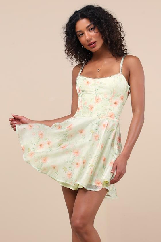 Add a little whimsy to your summer with this airy floral dress that pairs best with a sunny date. Adjustable straps support a scoop neckline and a bodice with supportive boning, all adorned with scalloped trim. The fitted waist tops a twirly A-line mini skirt, while a lace-up design at the back lends a flirty finish. Hidden side zipper/clasp.