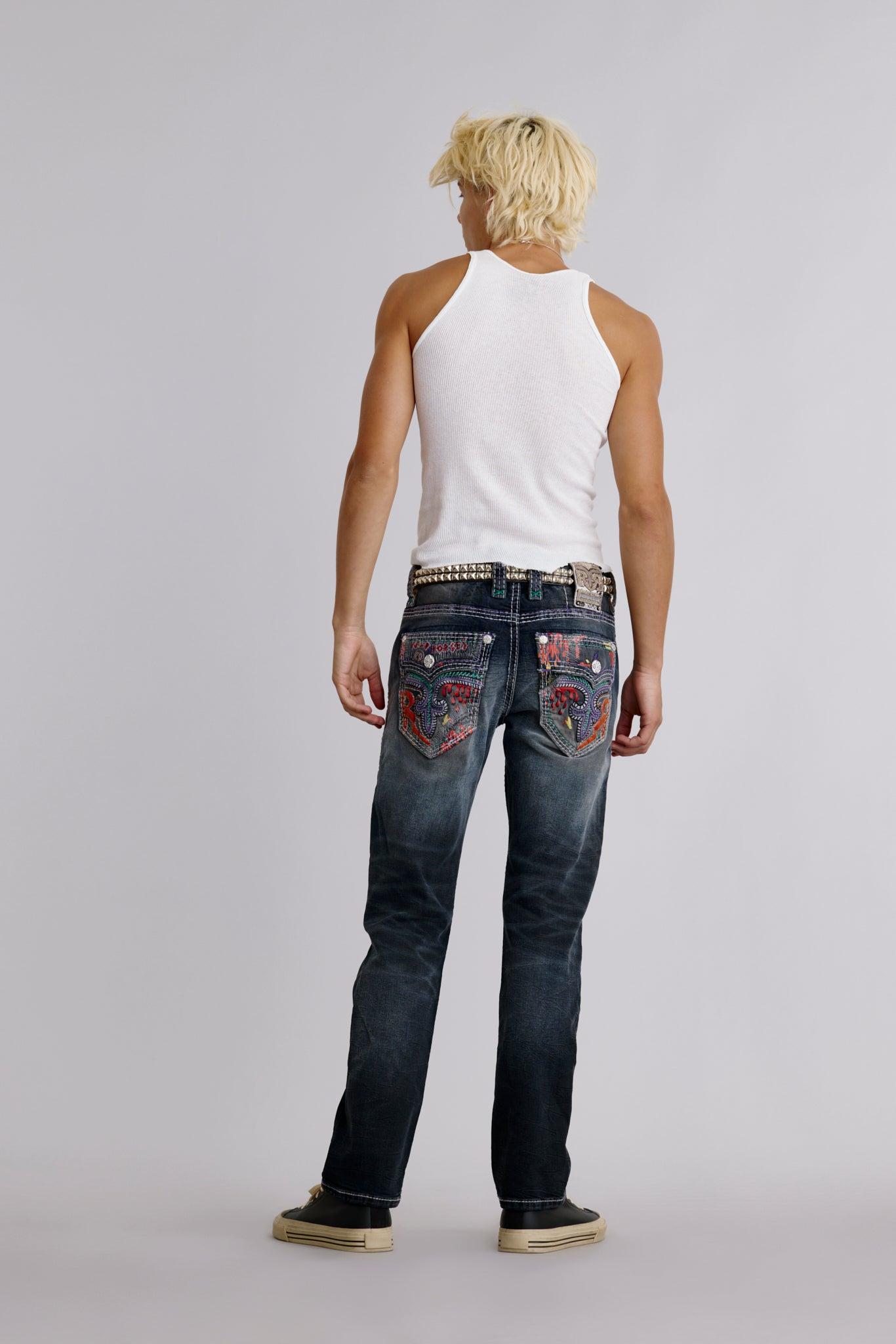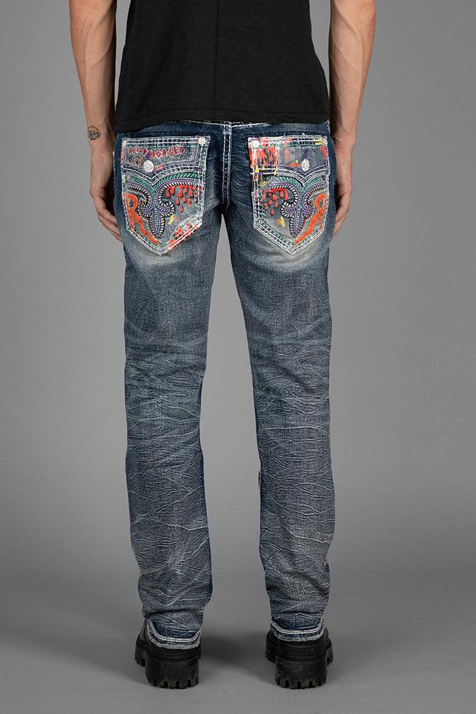 Rock Exhibition Series jeans. Jeans with a flaming inverted fleur-de-lis design. Decorated with multicolor stitching. Distressed legs featuring colorful patch artwork. Multi-color paint splatters on both front and back. Designed with care and creativity in Los Angeles, California.