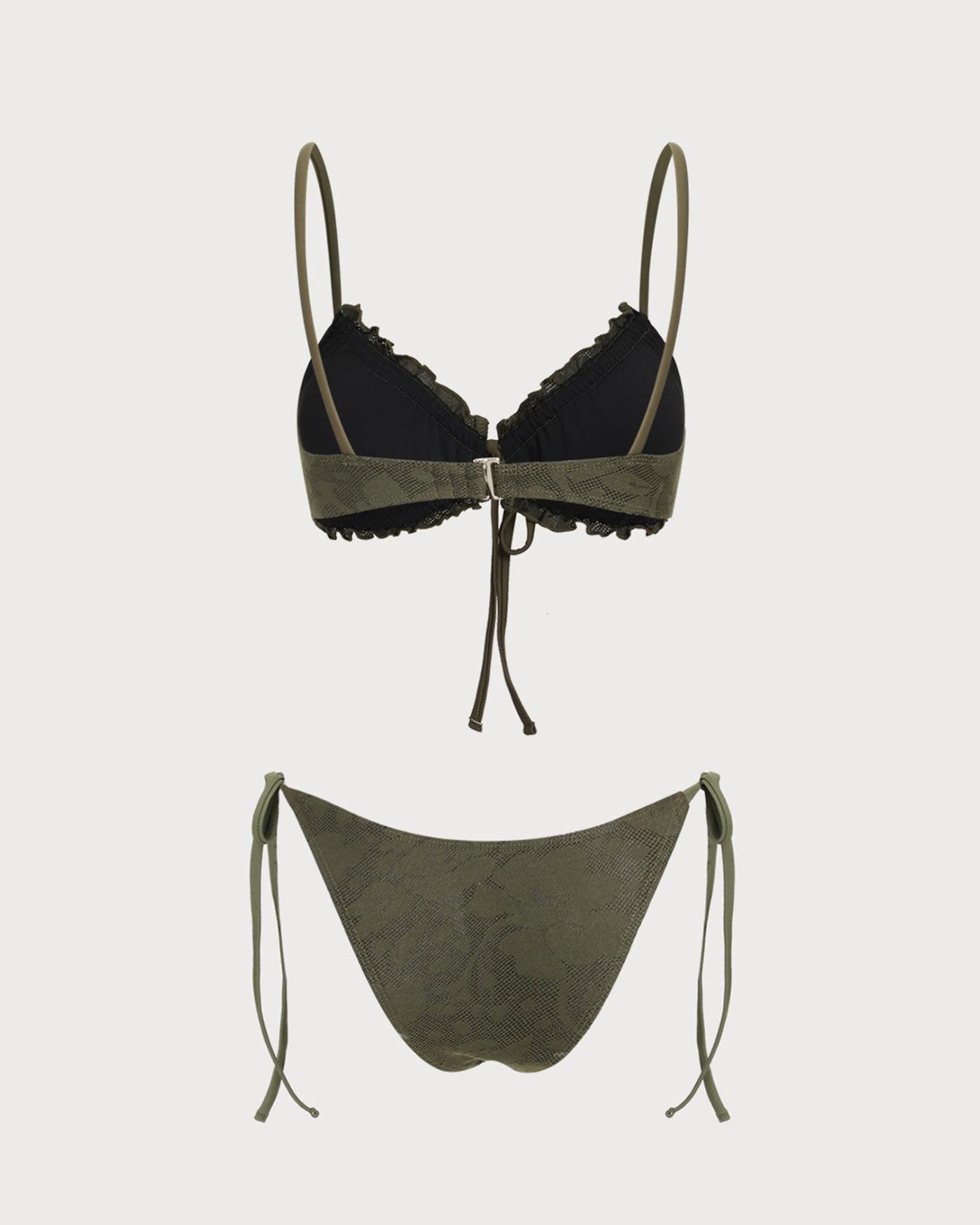 - Back Neckline: Strap - Fabric Stretch: High Stretch - Waist: Low Waisted - Closure Type: Drawstring - Pattern Type: Floral, Geometric - Embellishment: Tie, Knot, Bowknot, Tie Front, Textured, Jacquard - Neckline: V Neck - Fabric: Polyester 100.0% - Lining: Polyester 90.0%, Spandex 10.0% - Leg Opening: High Cut Leg - Padding: Removable Soft Cups - Bottom Coverage: Moderate Bottom Coverage - Bra Coverage: 3/4 Cup - Top Style: Bralette - Fabric Types(Pattern Style): textured