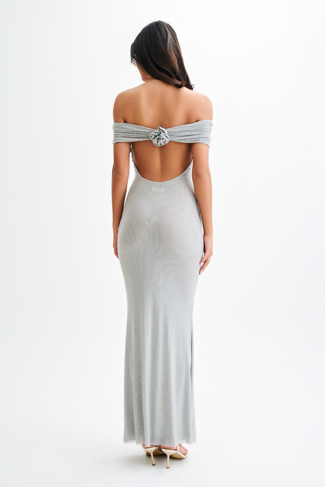 Main character as always.The ARNA Off Shoulder Diamante Maxi Dress exudes elegance and glamour. This bodycon dress features an off-the-shoulder design and a stunning fishtail hem, creating a dramatic silhouette. The gathered bust overlay adds a touch of sophistication, while the open back with back hardware provides a striking detail. With its maxi length, the Arna dress is perfect for making a statement at any special event.