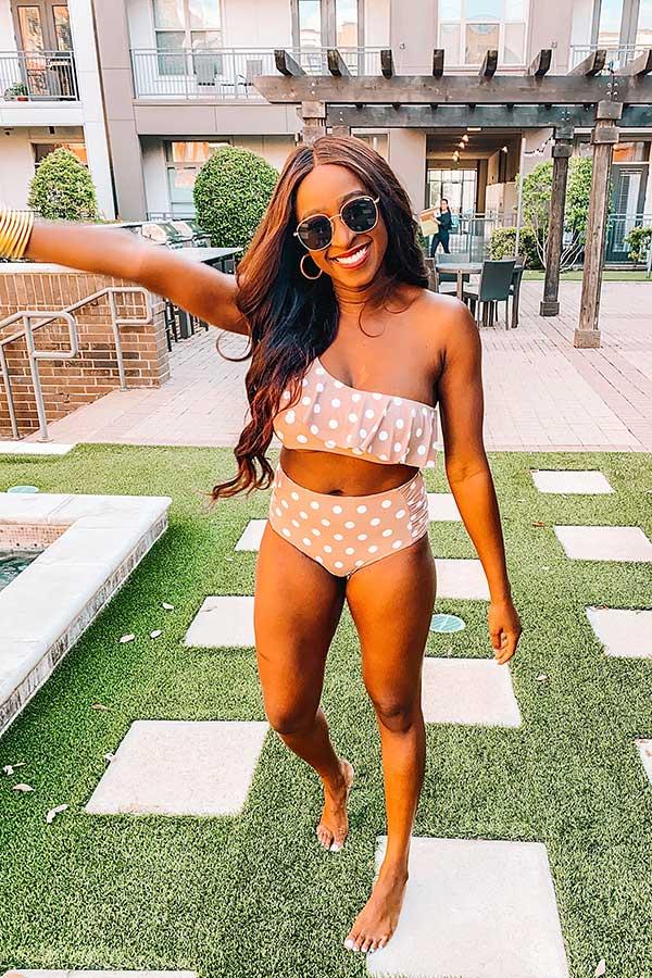 Lounge around the pool looking gorgeous in this timeless warm taupe colored bikini top featuring lightweight four-way stretch material patterned with a white polka dot print, and a bandeau bodice with an overlay detail that carries overs a single shoulder strap! This one shoulder bikini top comes with removable padding.