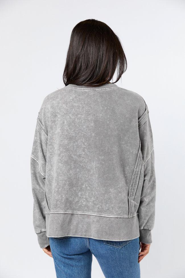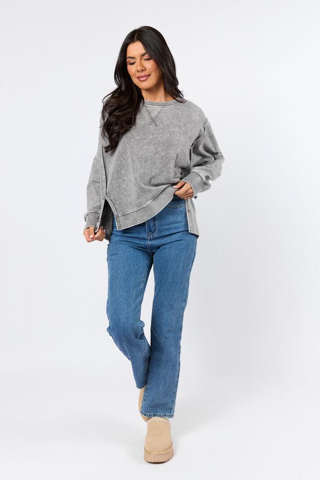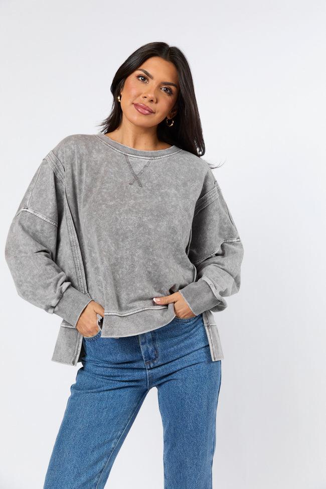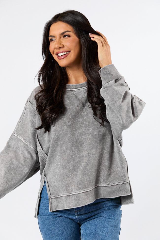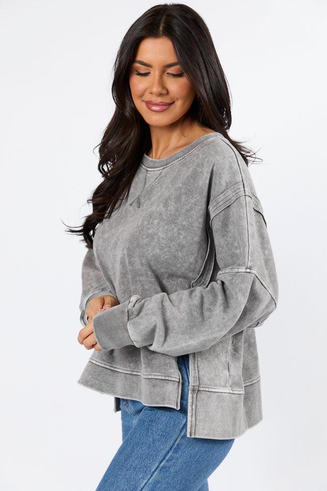Details Charcoal Acid Wash Knit Pullover Fabric has some stretch Crew neckline, exposed hem, long sleeves, bottom double hem split Unlined Size small from shoulder to hem: 22" Material and Care Self: 60% cotton 40% polyester, Contrast: 57% cotton 38% polyester 5% spandex Machine wash cold, lay flat to dry Patterns may vary Materials may have natural variations Colors may vary from different viewing devices.