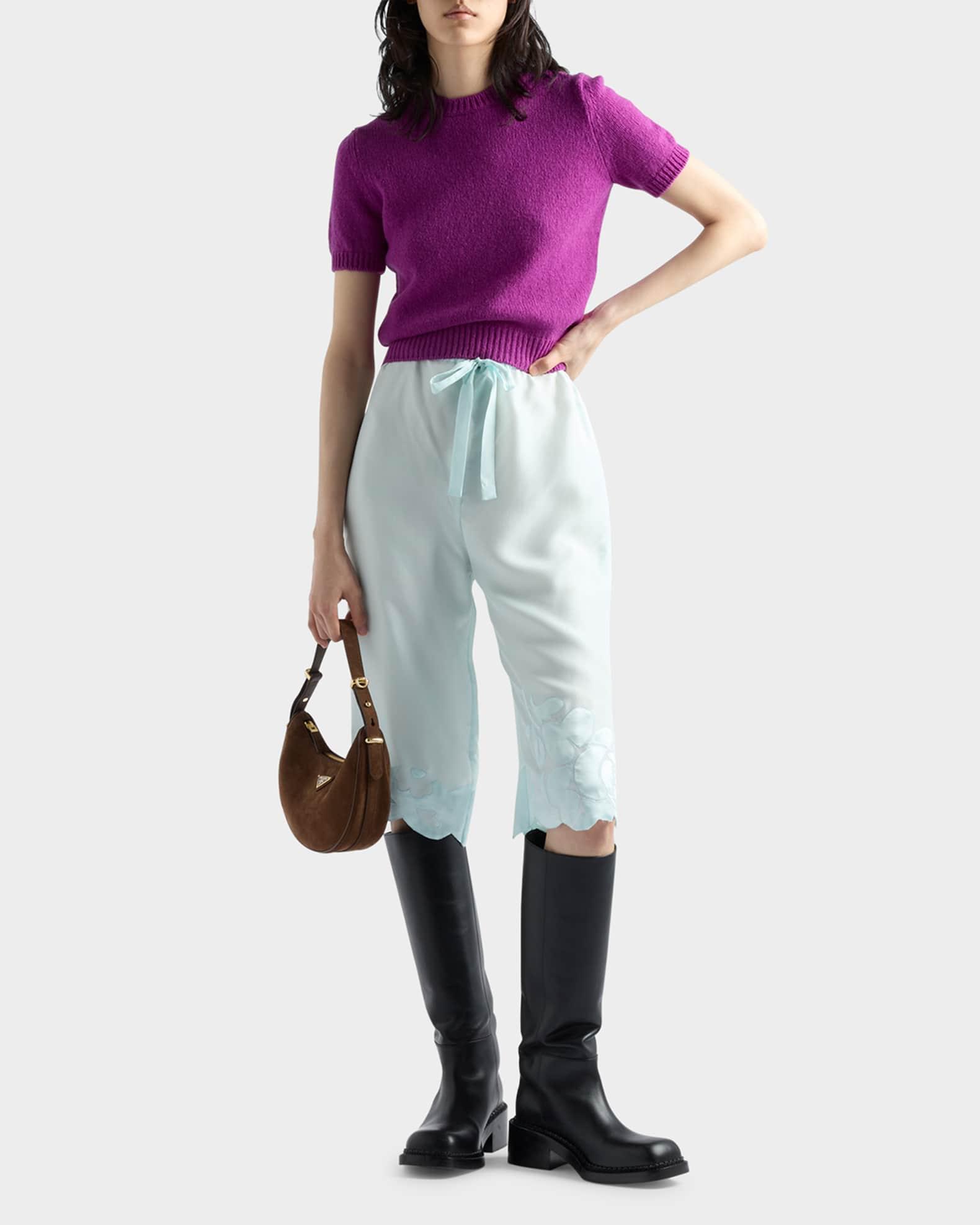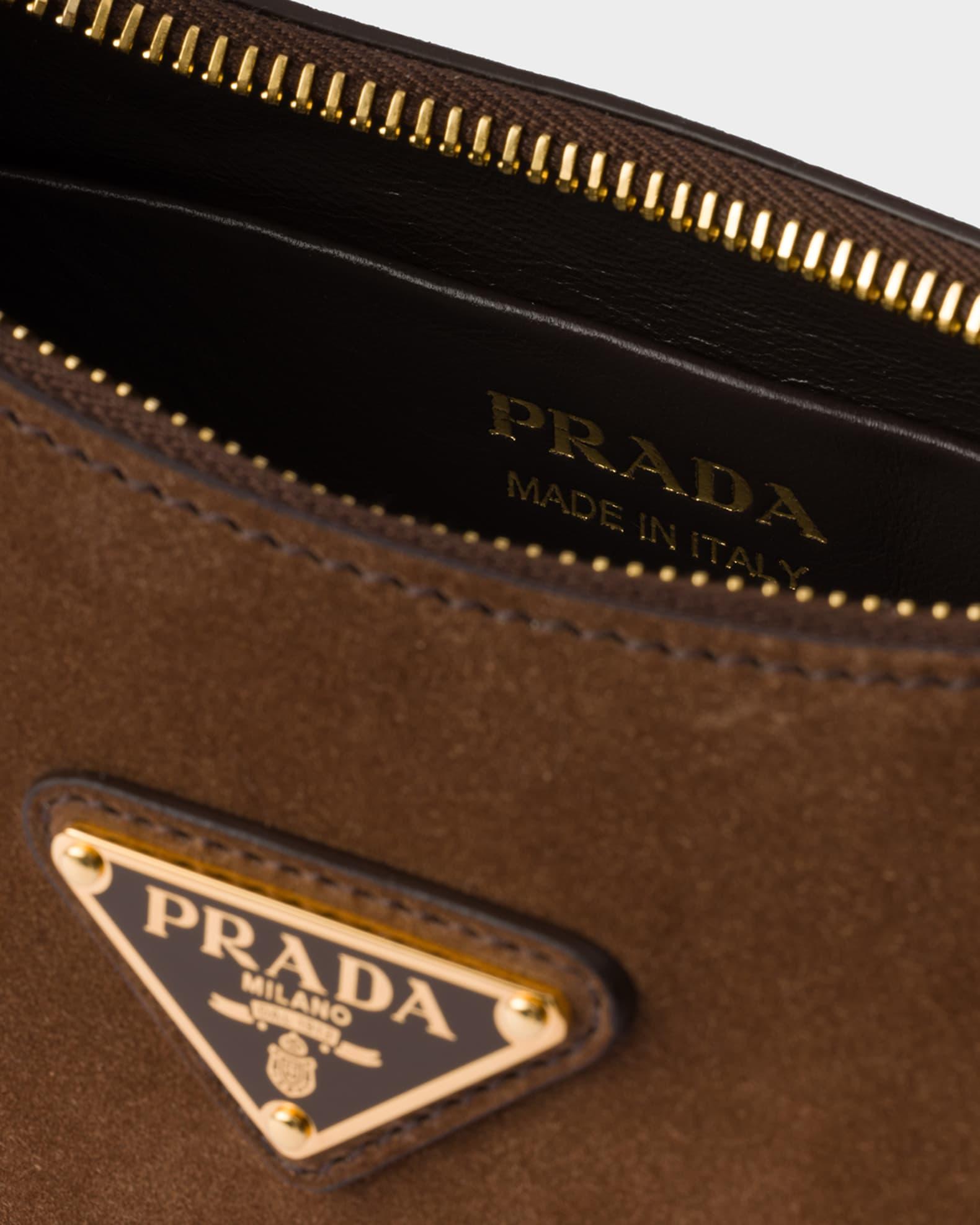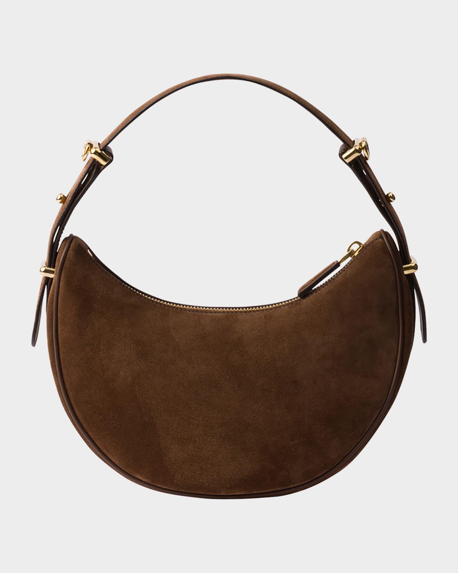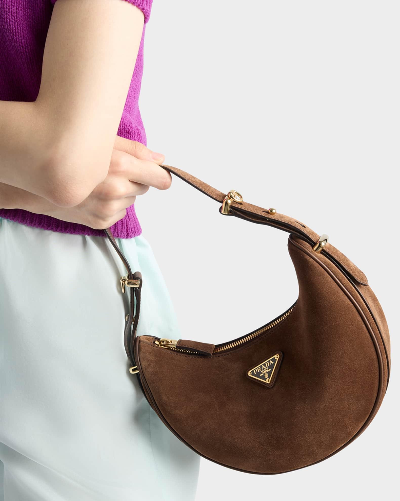 Prada "Arqué" shoulder bag in soft suede crafted in a crescent silhouette Detachable, adjustable top handle Detachable, adjustable shoulder strap, 23.6" max drop Zip top closure Signature enameled metal triangle logo Nappa leather interior Interior, one slip pocket Approx. 7.3"H x 8.9"W x 2.4"W Imported