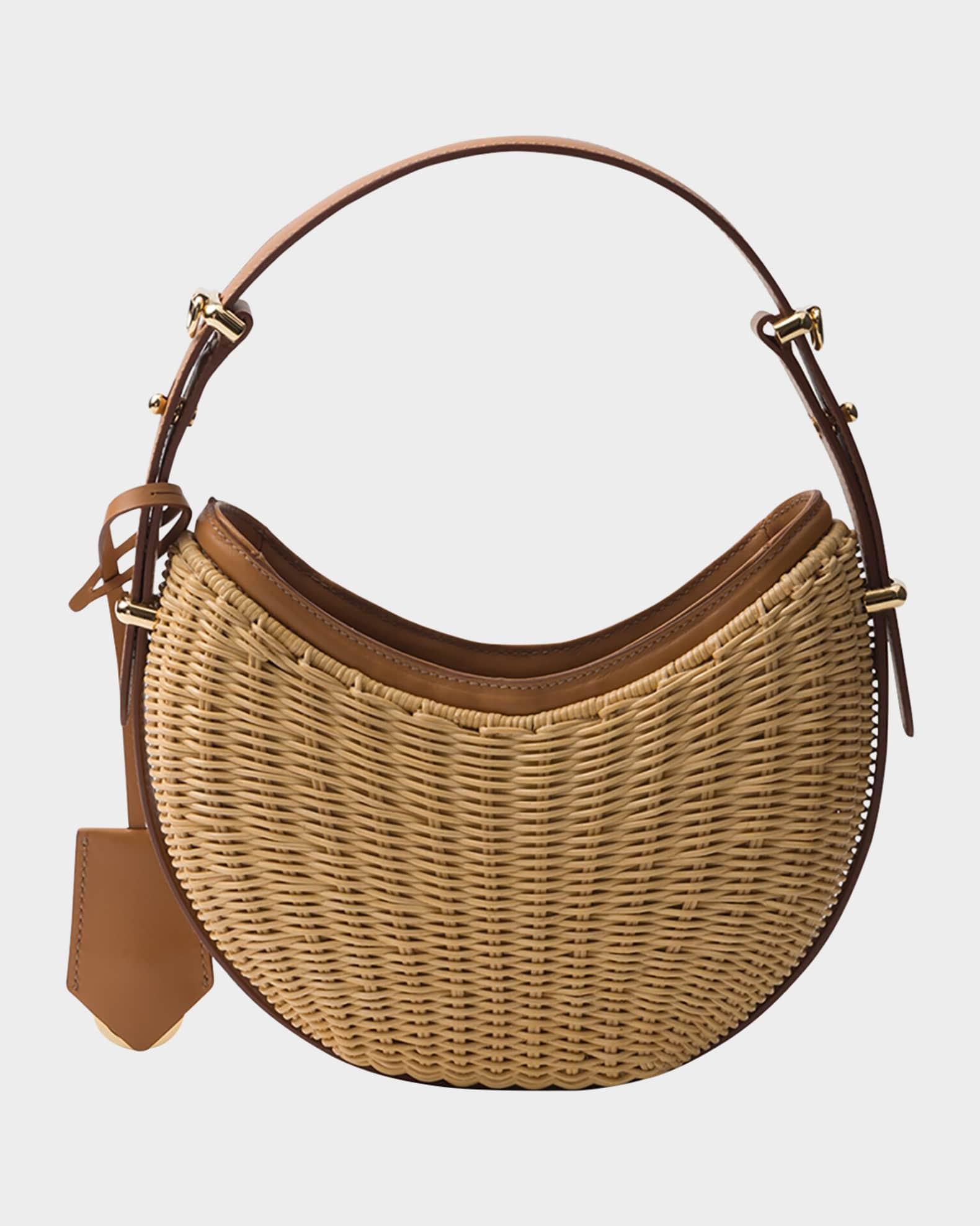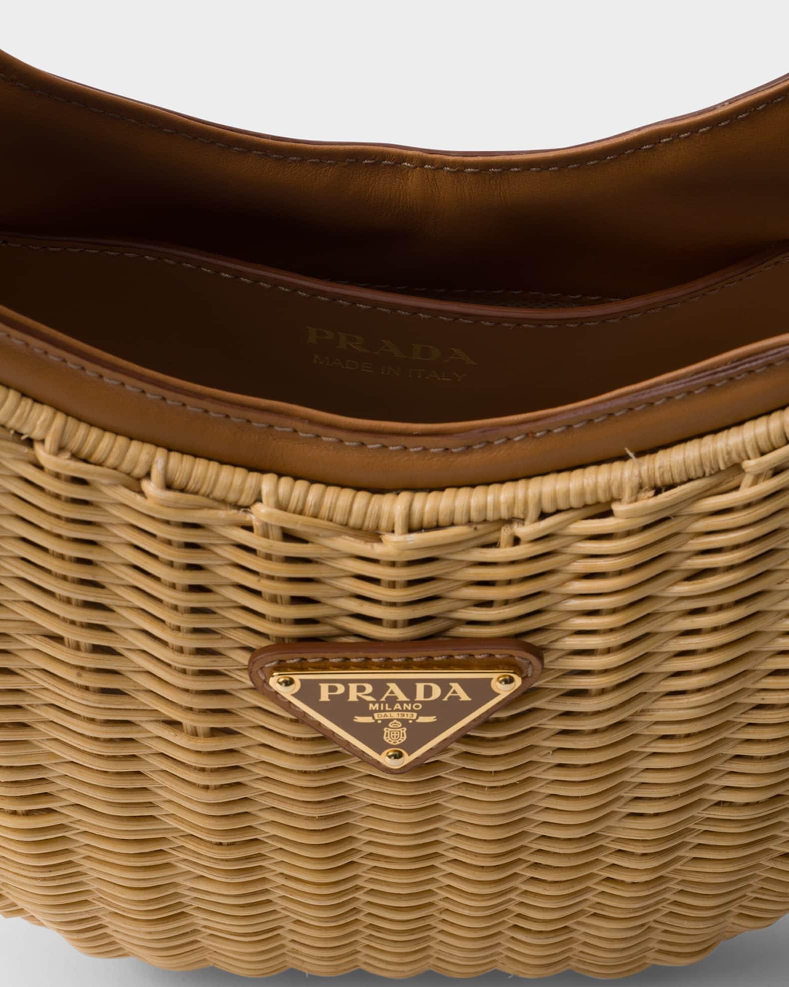 Prada "Arqué" shoulder bag, uniquely crafted in rattan wicker and calfskin leather Adjustable, detachable leather top handle Adjustable, detachable leather shoulder strap, 23.6" max drop Removable leather key ring Open top Signature enameled metal triangle logo Fabric lining Interior, one slip pocket Approx. 7.3"H x 8.9"W x 2.3"D Imported