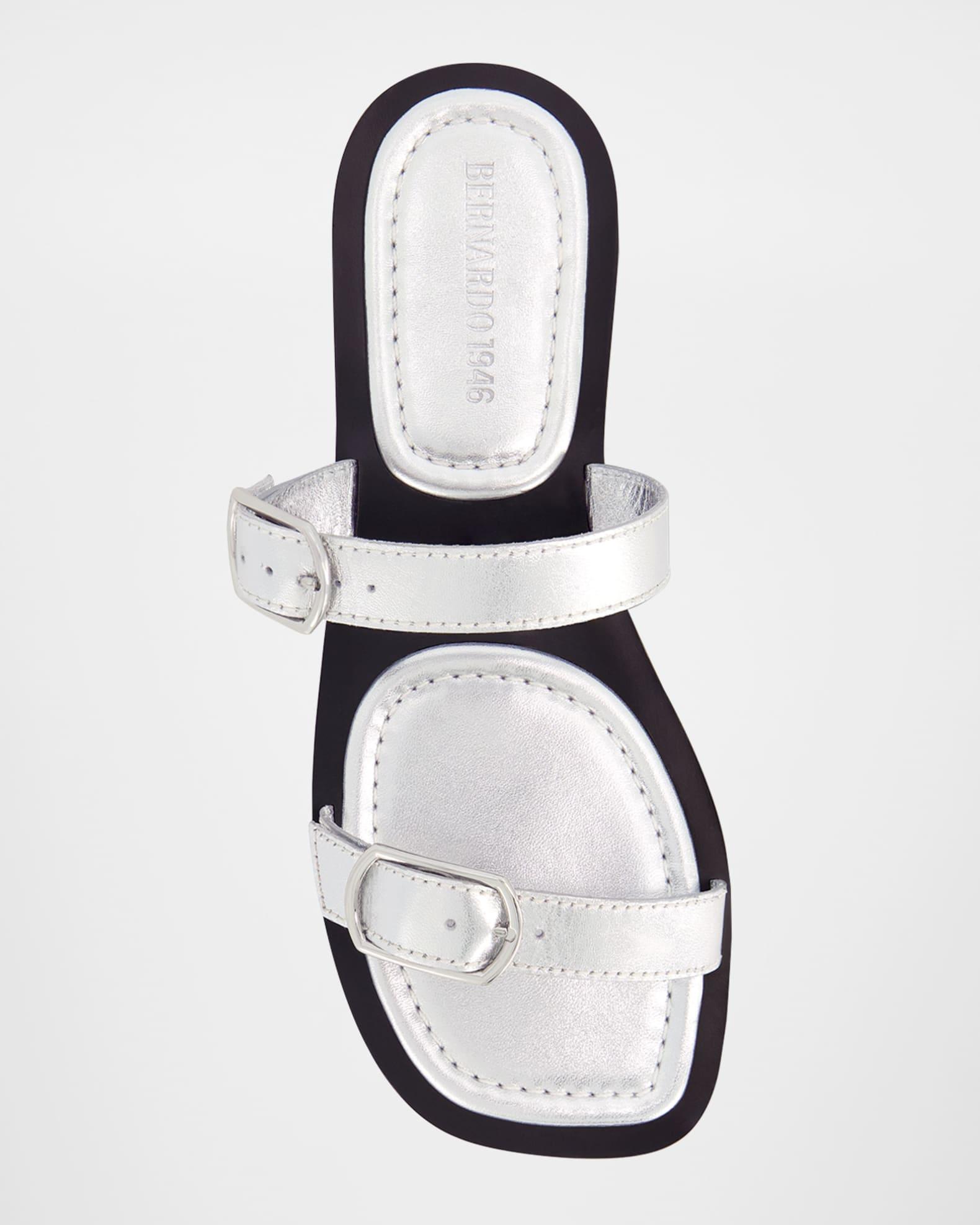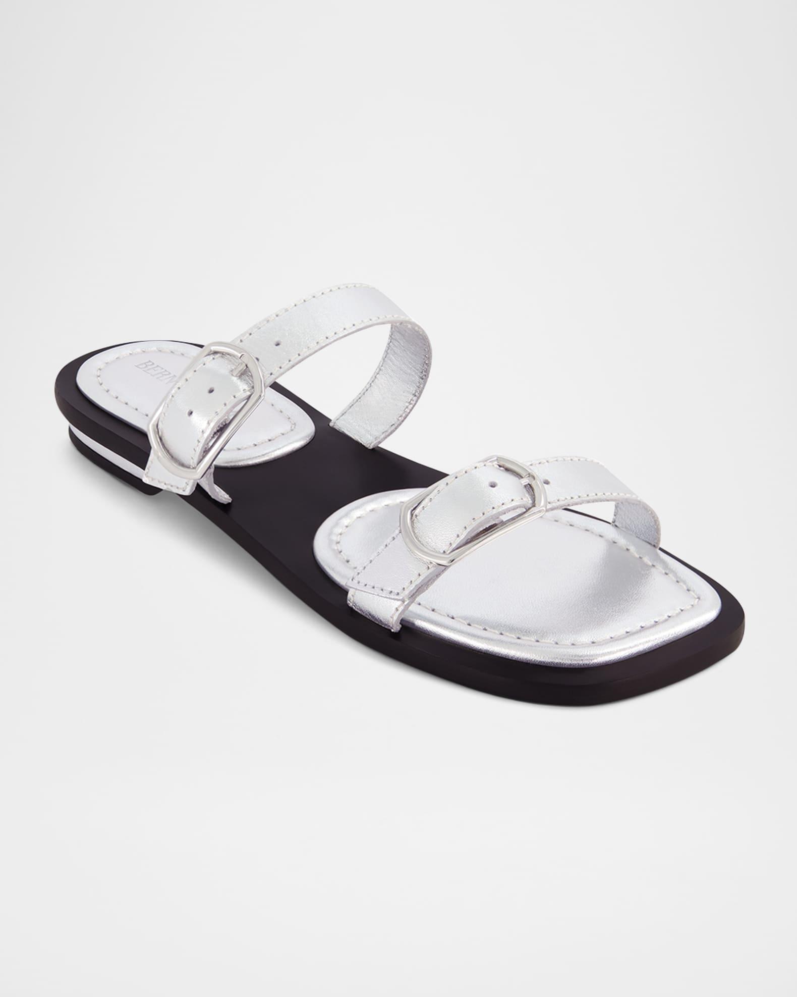 Bernardo 1946 "Arta" sandals in metallic leather The capsule collection takes inspiration from their archives, reflecting their founder Bernard Rudofsky’s dedication to timeless design, premium materials, artisan handcrafted quality, and uncompromising comfort. Flat heel Open toe Double buckle strap vamp Slide style Leather outsole Lining: Leather Professional cleaning recommended Made in Brazil