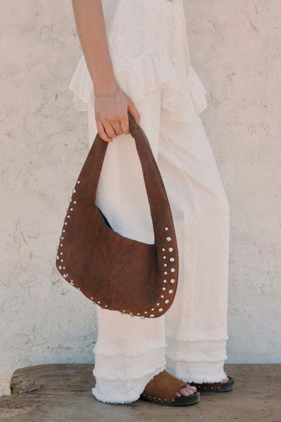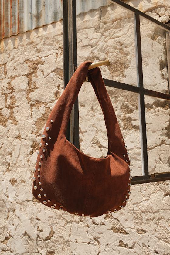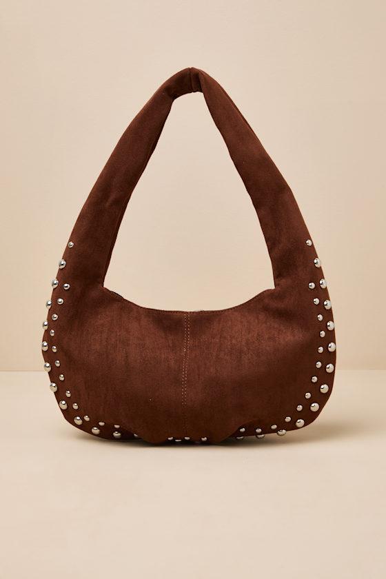 Looking for a go-to that pairs with everything and always looks cute? Well then, let this soft, faux suede handbag get the job done in effortless style. A flexible shoulder strap supports the slouchy, crescent-like silhouette that features shiny studded detailing and a magnetic closure that reveals a spacious interior with a sidewall pocket.