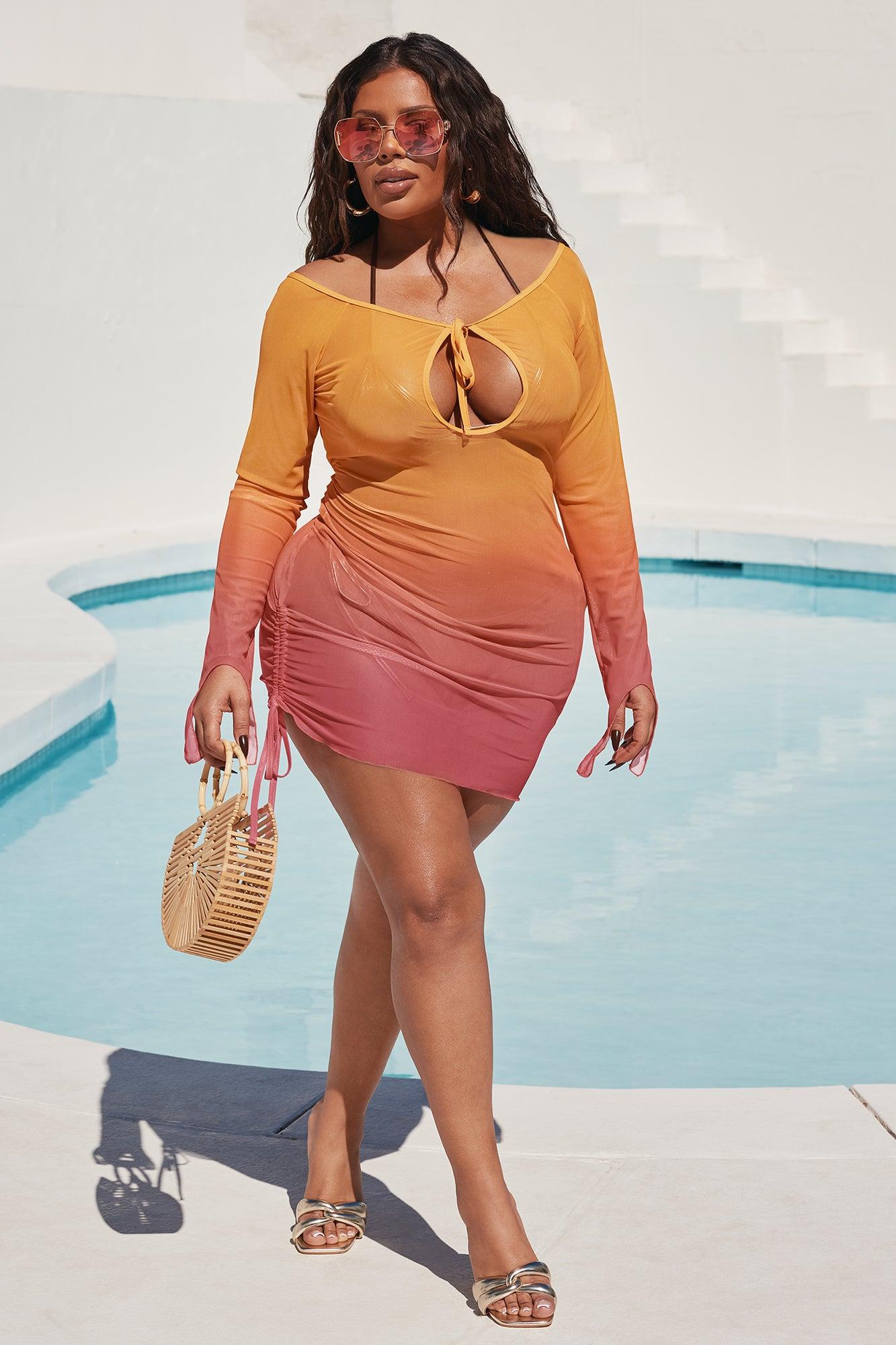 Available In Red/combo. Cover Up Dress Sheer Mesh Off Shoulder Long Sleeves Cutout Front Ties Side Ruching Mini Length Ombre Gradient Full Stretch Final Sale 95% Polyester 5% Spandex Imported California Proposition 65WARNING: Cancer and Reproductive Harm - www.P65Warnings.ca.gov.