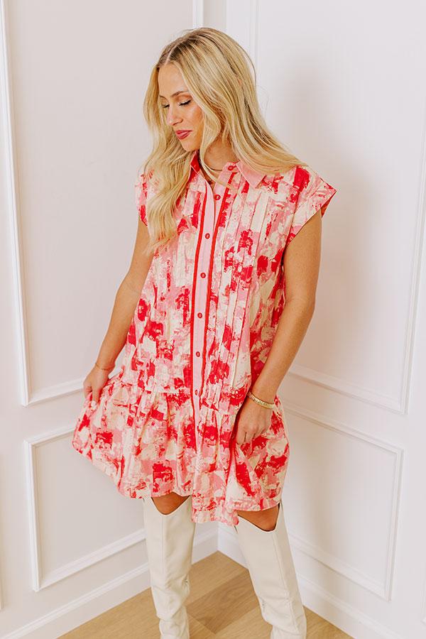 - Add a pop of sunshine to your wardrobe with this cute mini dress! With a trendy print and classic cut, this piece is perfect for spreading good vibes wherever you go. - Lined, lightweight material with an abstract design featuring cream, scarlet, and a pink hue - A collared neckline - Short sleeve with rolled cuffs - A buttoned front - Pleated detailing on the front - Hidden side pockets - A relaxed silhouette that ends in a straight, mini dress length hemline