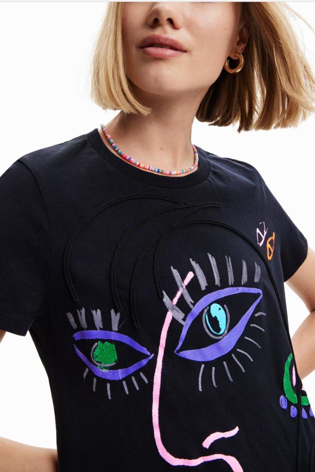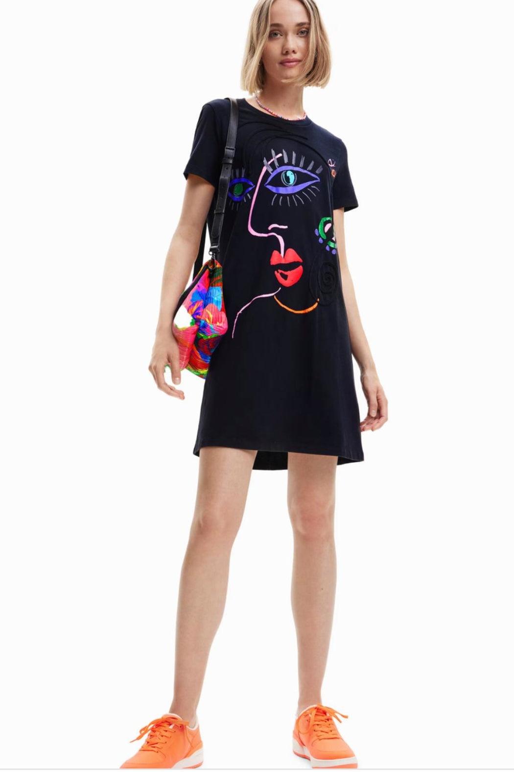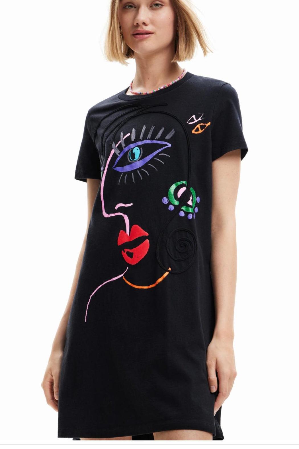 A short, loose-fitting T-shirt dress with short sleeves and an arty face print on the front.