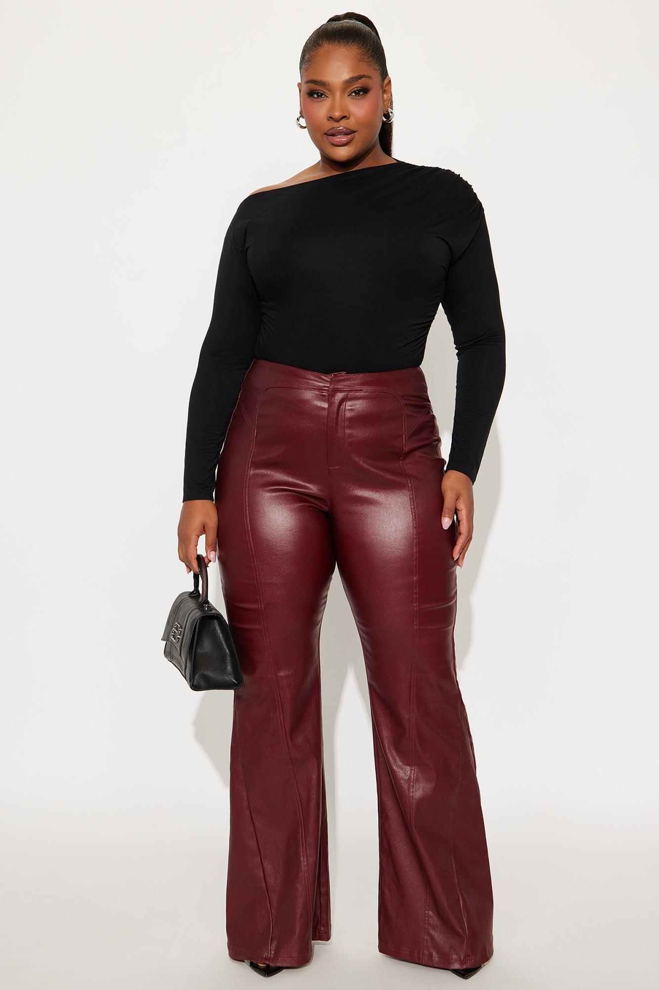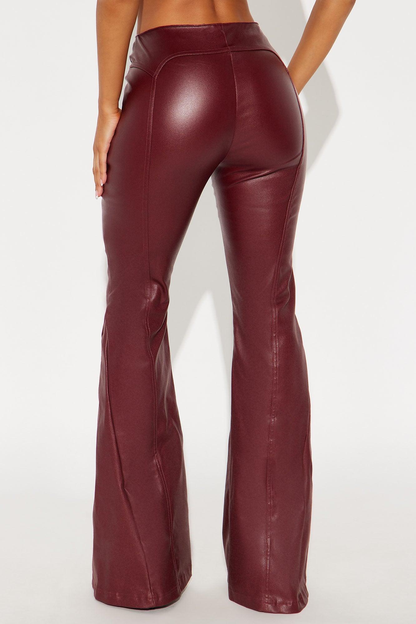 Available In Burgundy. Coated Twill Stretch Flare Pant Stretch Regular 34" Inseam Mid Rise Button And Zipper Closure Self : 77% Rayon 20% Nylon 3% Spandex Imported California Proposition 65WARNING: Cancer and Reproductive Harm - www.P65Warnings.ca.gov.