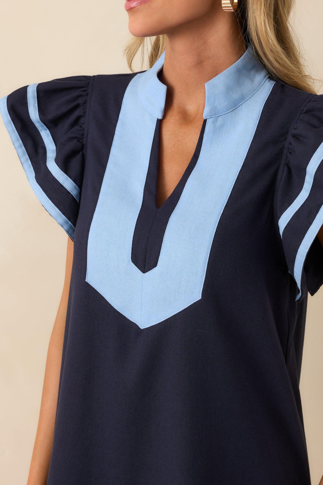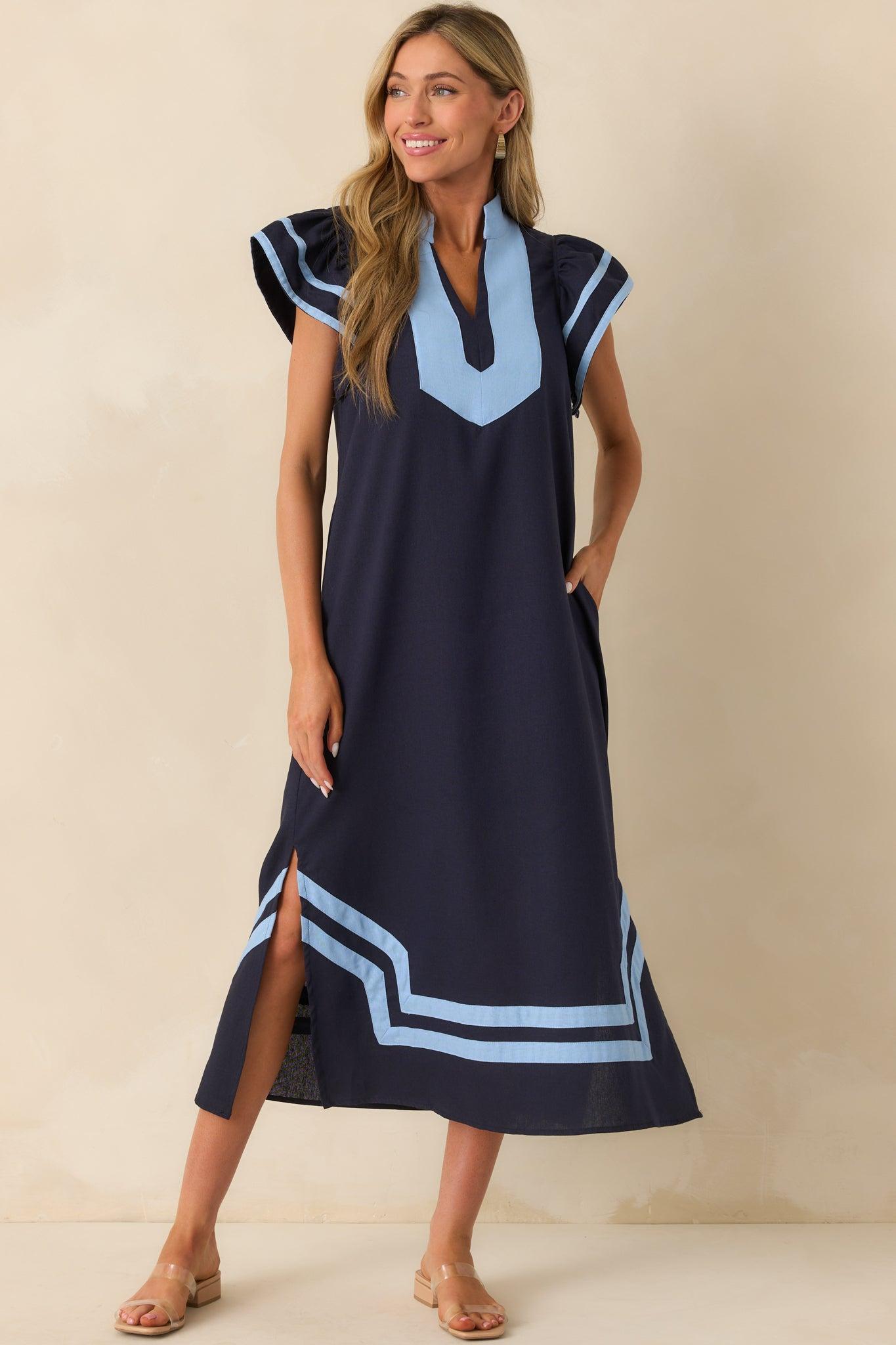 The As Good As It Gets Linen Cotton Blend Kaftan Maxi Dress is all about ease that feels elevated. Relaxed, refined, and ready for anything—it’s your go-to for embracing comfort without compromising on style. This navy maxi dress features a light blue contrast trim throughout, notch v-neckline, short flutter sleeves, bottom hem vent slits, navy lining, and functional pockets.