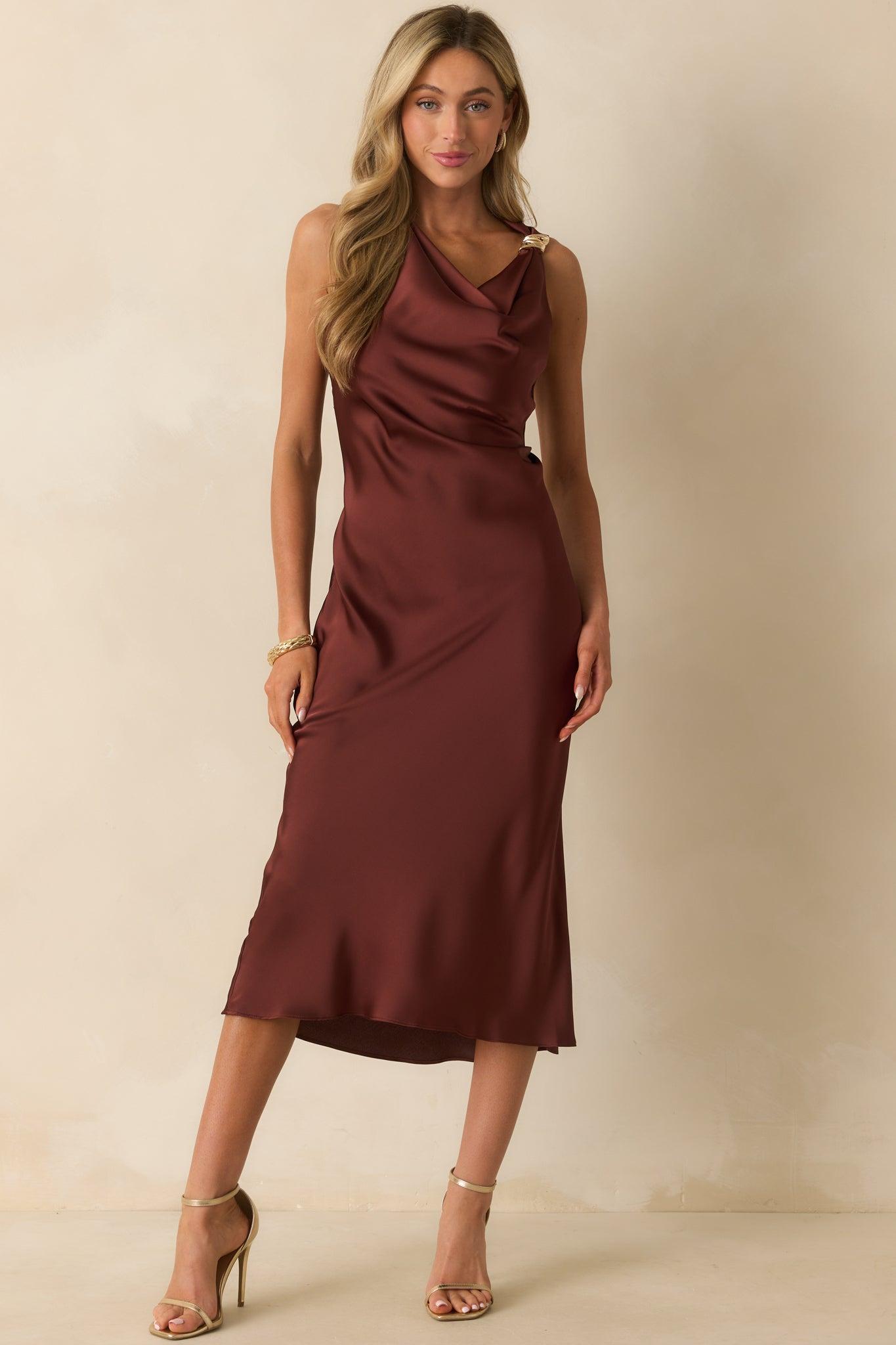 The As I Expected Brown Satin Cowl Neck Sleeveless Midi Dress delivers just what you had in mind, a polished look that feels as effortless as it does refined. This midi dress features a brown satin fabric, a draped cowl neckline, gold shoulder ring detail, sleeveless design, bias-cut construction, and a concealed side zipper. 100% Polyester Unlined Hand Wash Cold Manufactured in China Designed in The USA Model is 5'8" and Wearing a Size Small