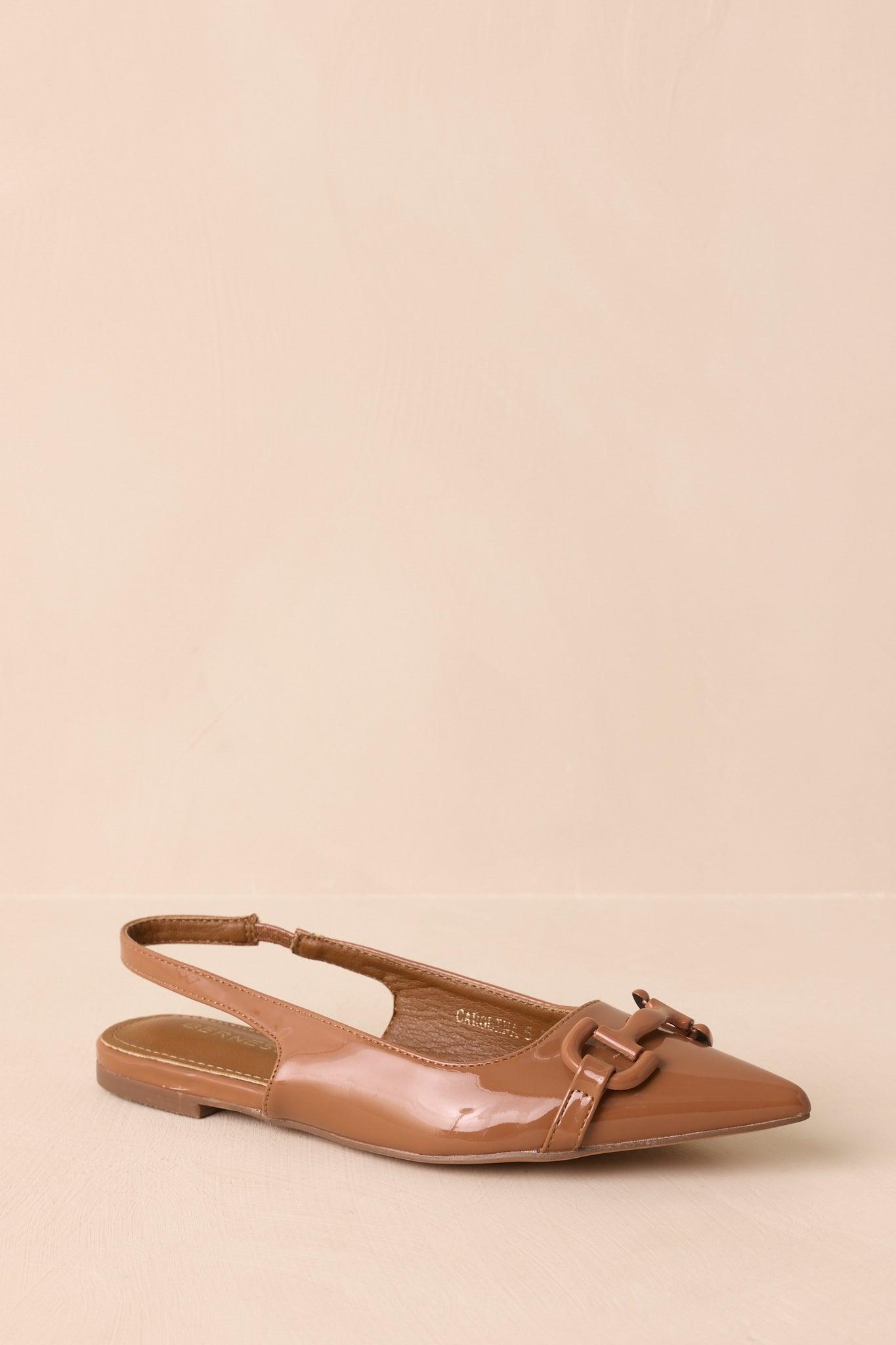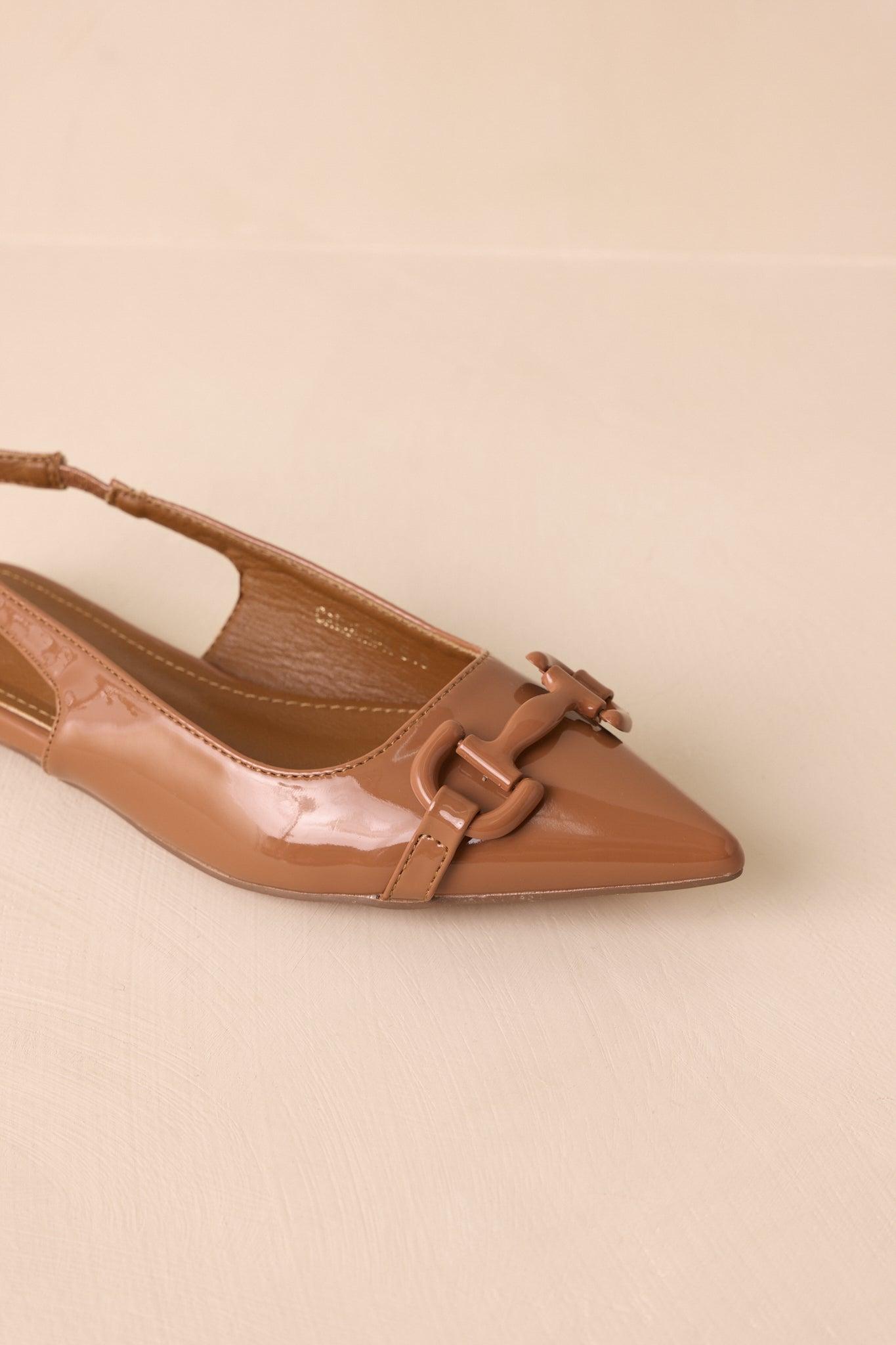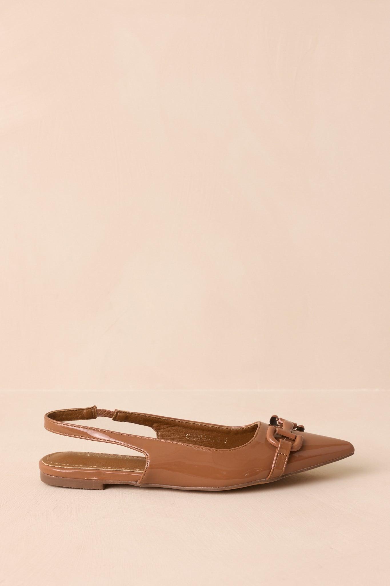 The As It Stands Mocha Brown Patent Pointed Toe Slingback Flats bring a sleek touch to your everyday style, striking the perfect balance between playful edge and polished sophistication. These mocha brown shoes feature a shiny patent finish, a pointed toe, slingback strap with elastic insert, gold horsebit detail across the vamp, and a flat sole. All Man Made Materials Non-Skid Sole Designed in The USA Manufactured in China True To Size, Wide Foot Friendly
