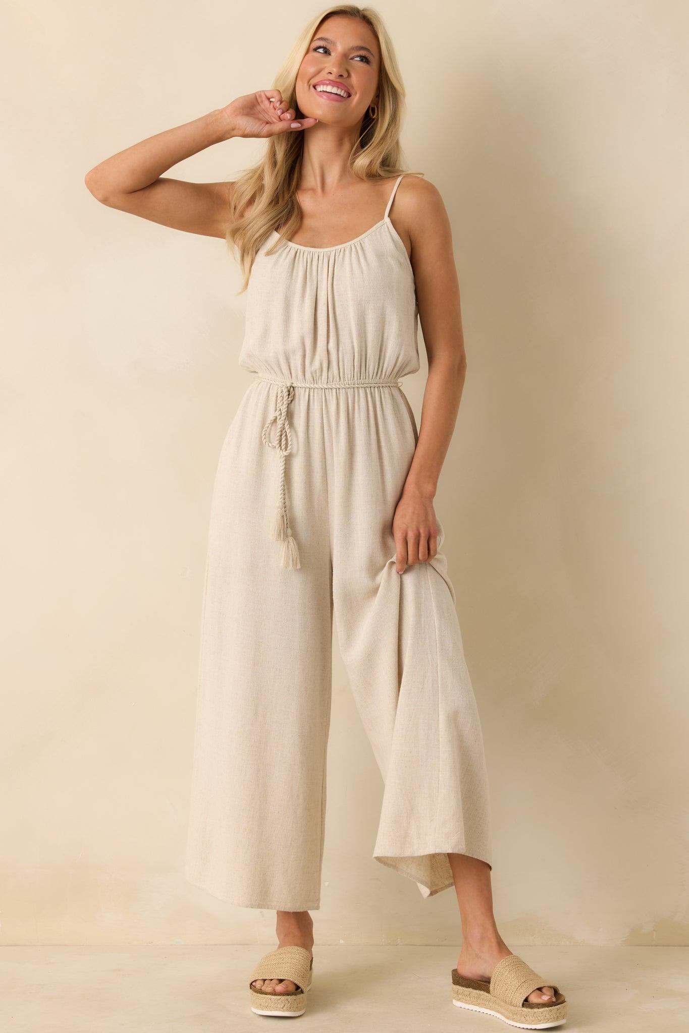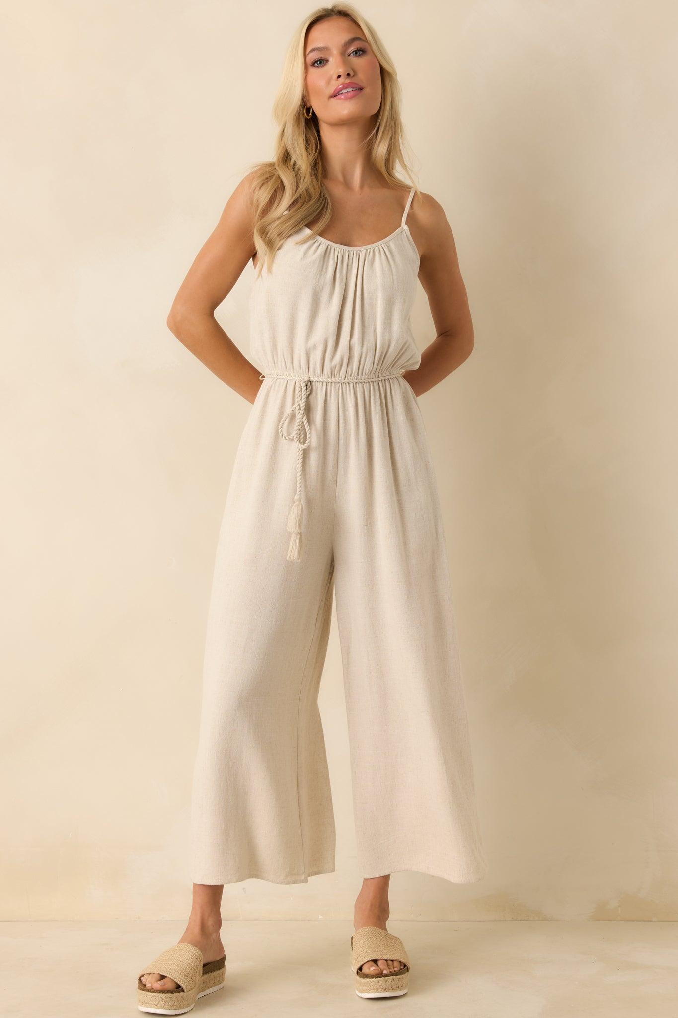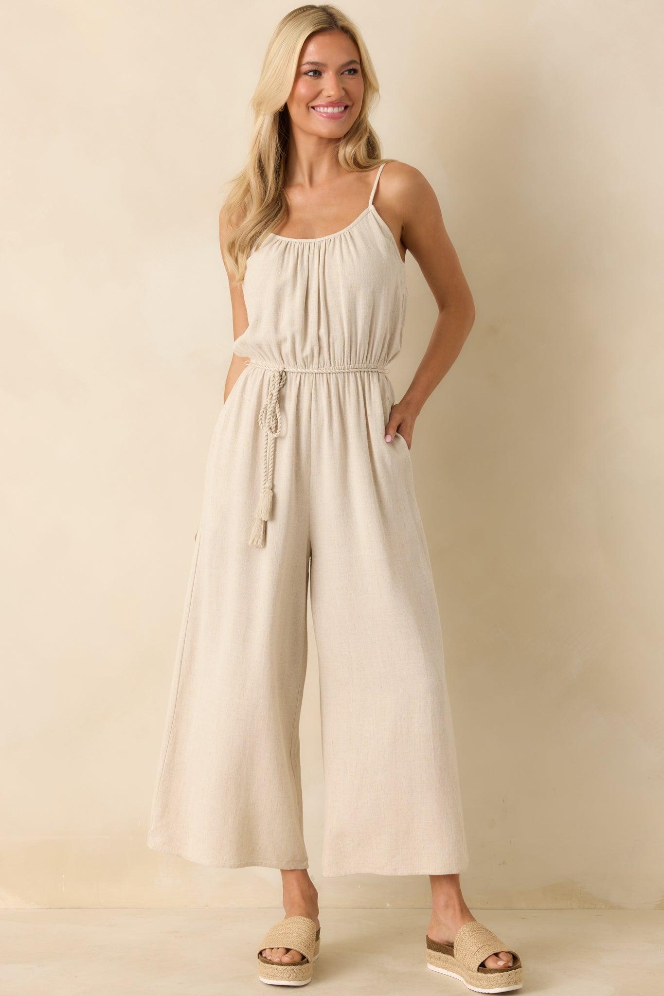 The As Simple As That Natural Linen Blend Sleeveless Jumpsuit is perfect for days when you want your look to feel both relaxed and refined. With an easy elegance, it’s a versatile choice for casual outings, weekend plans, or a laid-back lunch date. This natural beige jumpsuit features a scoop neckline, adjustable spaghetti straps, smocked back panel, elastic waist, optional self-tie rope belt with fringe tassels, wide leg design, and functional pockets.