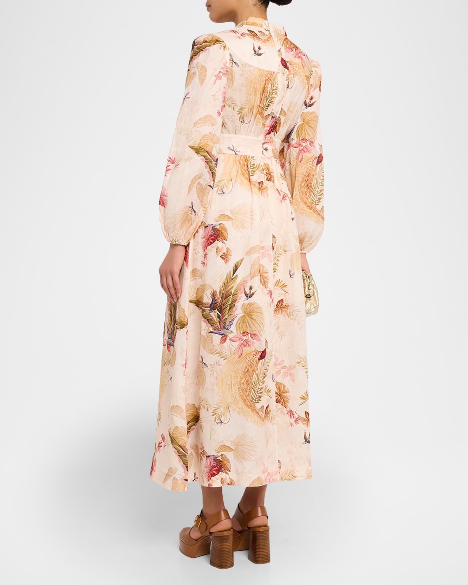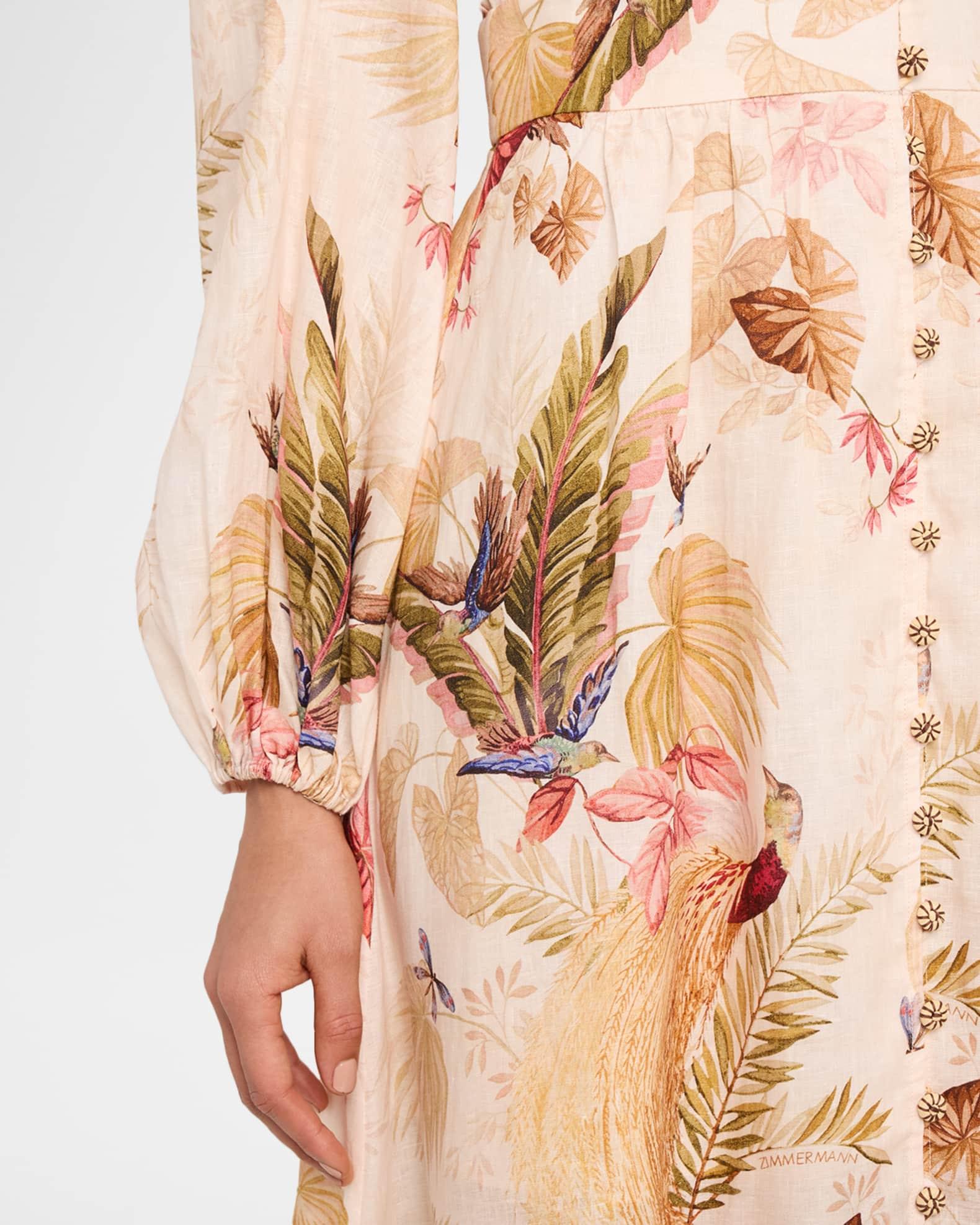 Zimmermann "Ascension" printed linen shirtdress finished with floral buttons Slight stand collar; plunging V neckline Long puff sleeves with elastic cuffs Defined waistband A-line silhouette Full length Center back zip Linen Lining: Cotton Dry clean Imported Size conversion: 0 = X-Small, 1 = Small, 2 = Medium, 3 = Large