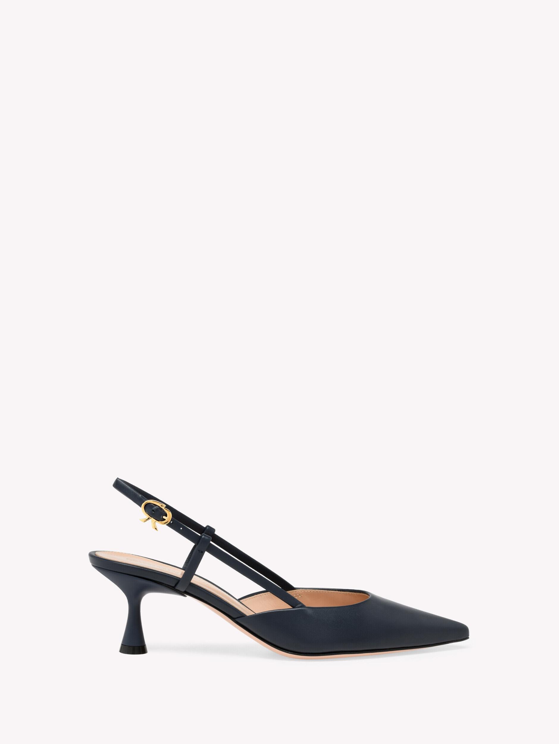 Set on a 55mm flare kitten heel, Ascent 55 is a pointed-toe slingback. The iconic Ribbon buckle in gold metal, signature of the brand, elegantly enriches the ankle strap. Handmade in Italy.