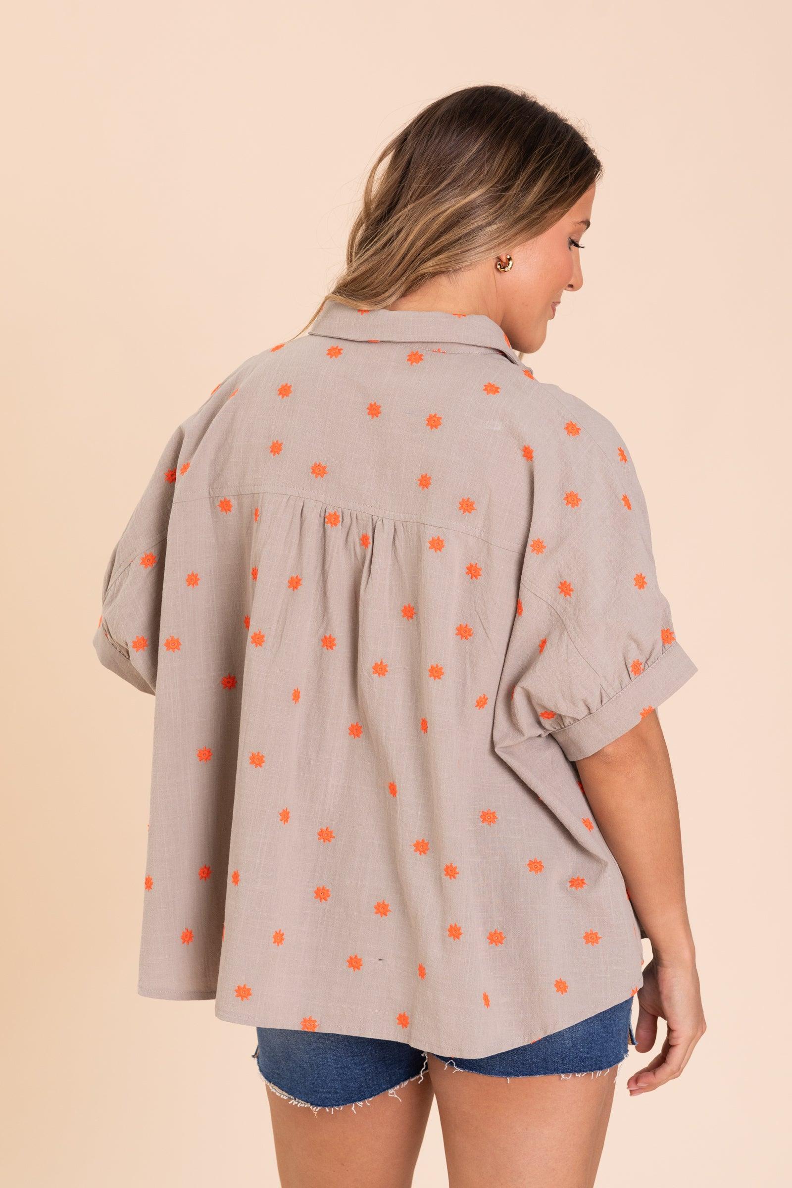 Product Details Colors: Ash Mocha, Orange Print: Floral Neckline: Button Down Sleeve: Short Sleeve Hemline: Straight Brand: Easel Material and Care Self: 100% Cotton Hand Wash Cold Hang/Line Dry Size and Fit Small: Bust 66" Waist 68" Length 24.5"/26.5" Medium: Bust 68" Waist 70" Length 25"/27" Large: Bust 70" Waist 72" Length 25.5"/27.5 Model is 5'7 and is wearing a size small