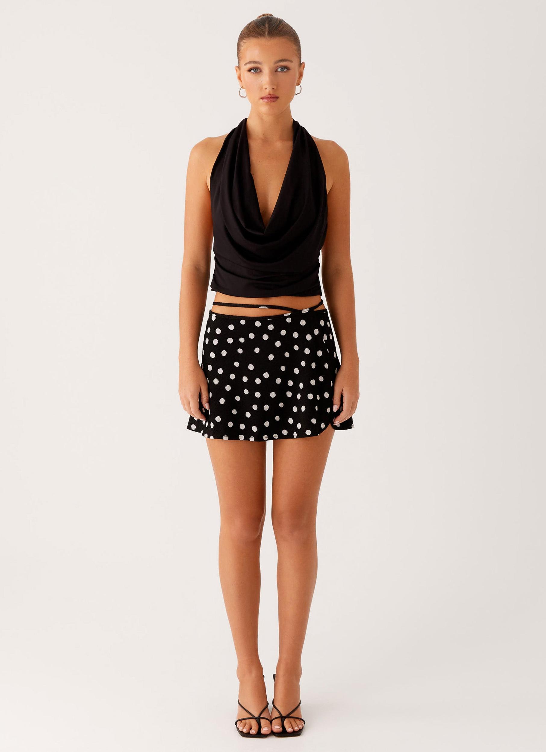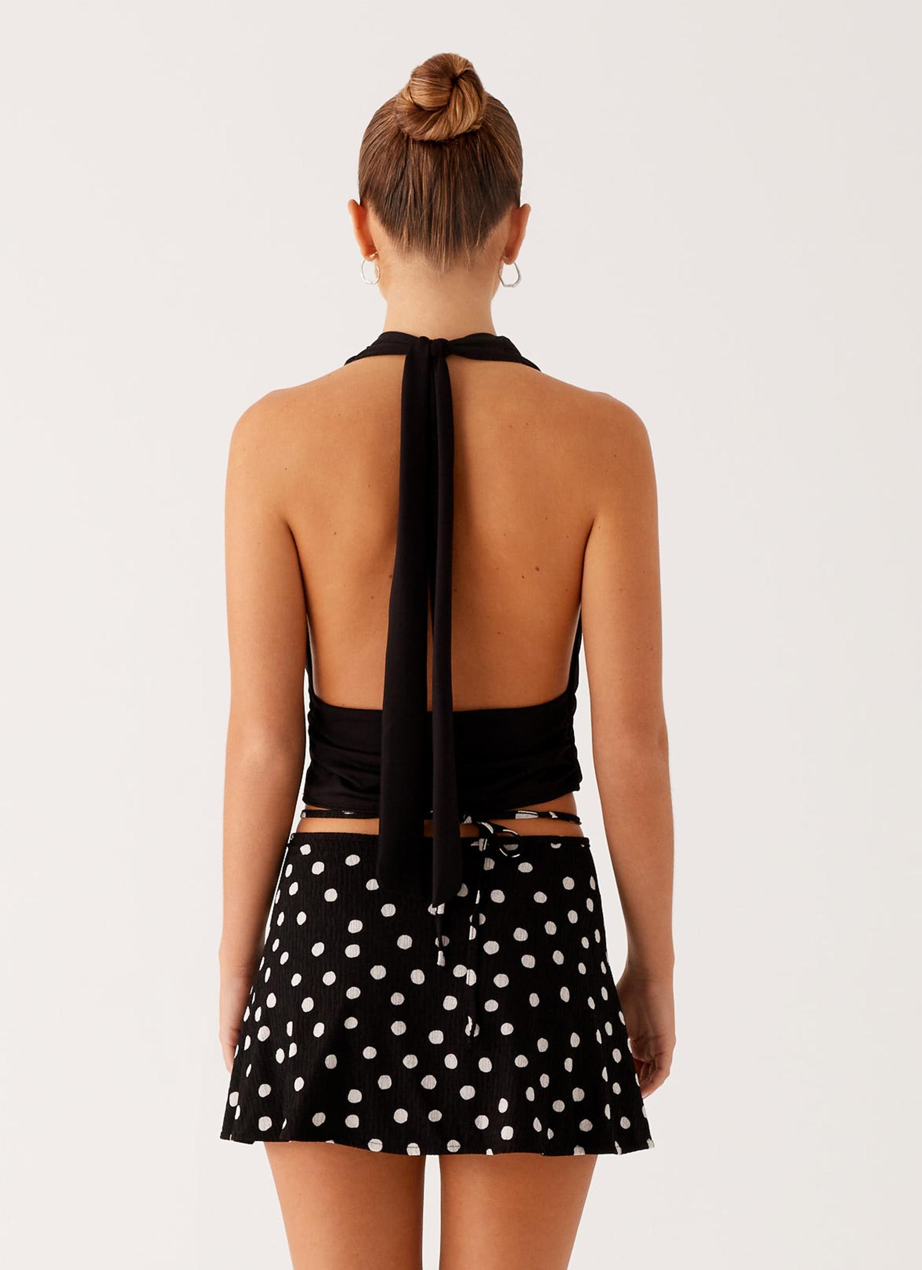 Peppermayo Exclusive Made for unforgettable nights, the Ashi Cowl Top in Black drapes you in elegance. With a deep cowl neckline, low back, and adjustable neck ties, this mid-length beauty is all about sultry sophistication from every angle. - Deep cowl neckline- Low back- Mid length- Adjustable neck ties- Fabric:100% Polyester, L: 95% Polyester, 5% Spandex Size AU 8 / US 4 garment measurements: Length: 50 cm / 19.69 inWaist: 60 cm / 23.62 inHem: 76 cm / 29.92 in Yasmin is 174cm and wears size AU 6 / size US 2