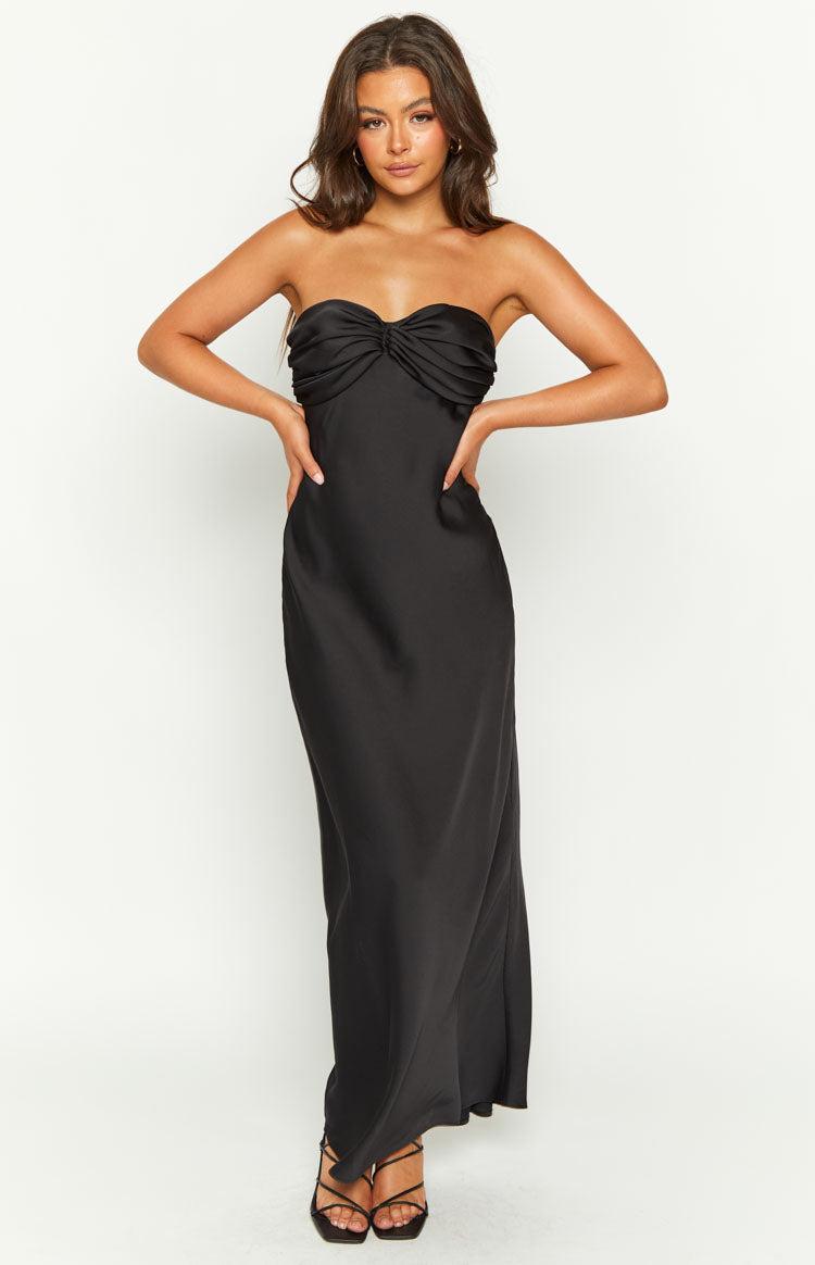 Black Maxi Dress This maxi dress has you sorted for your next event! Sleek, black and sexy paired with some gorg staple heels and a shoulder bag. Maxi length Strapless Ruched detail at bust Mid weight satin material Rigid material with no stretch Invisible zip at side This is the perfect formal dress for your next event!