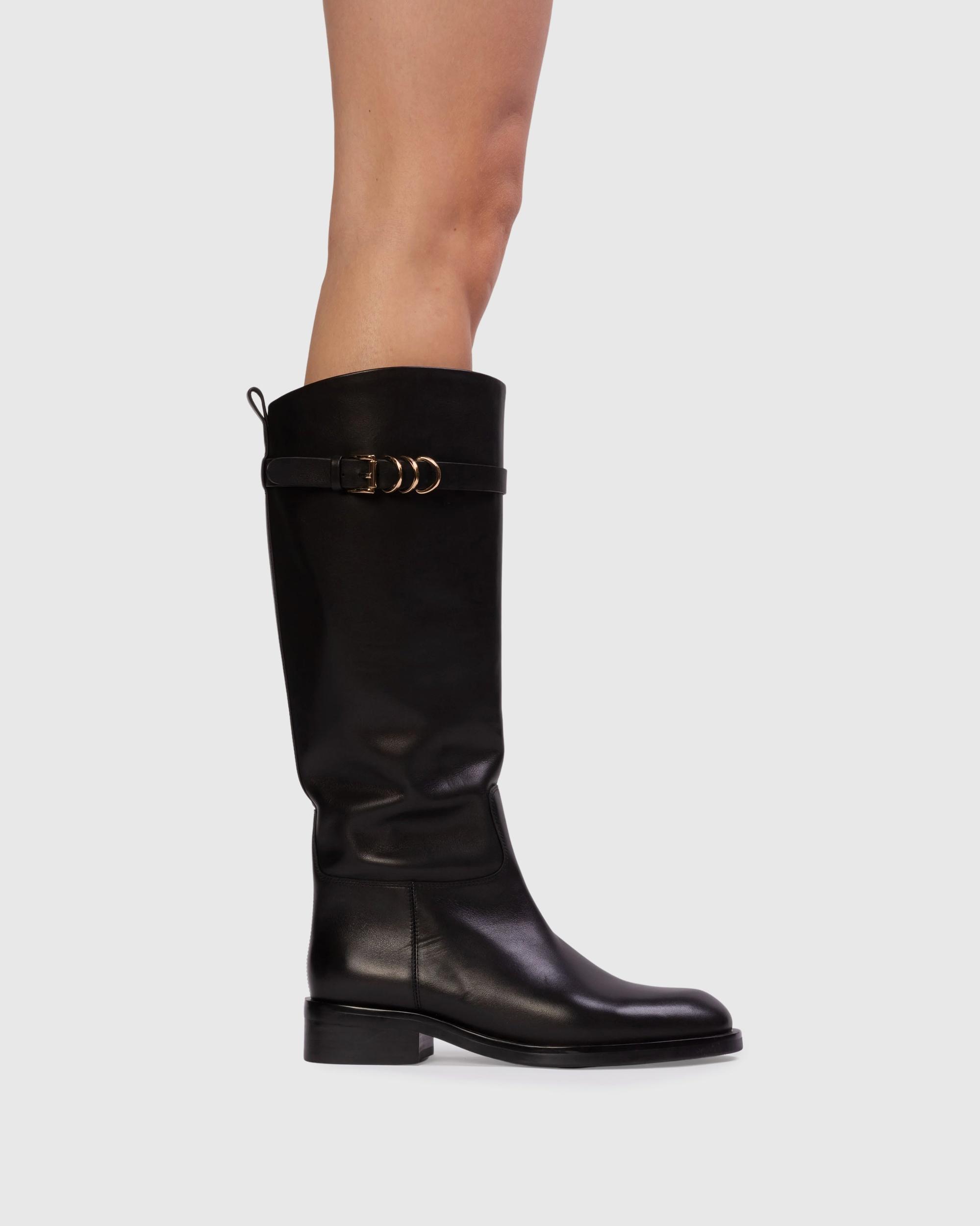 Below the knee classic rider boot with an upper strap with buckle detail. Made with smooth baby calf leather.