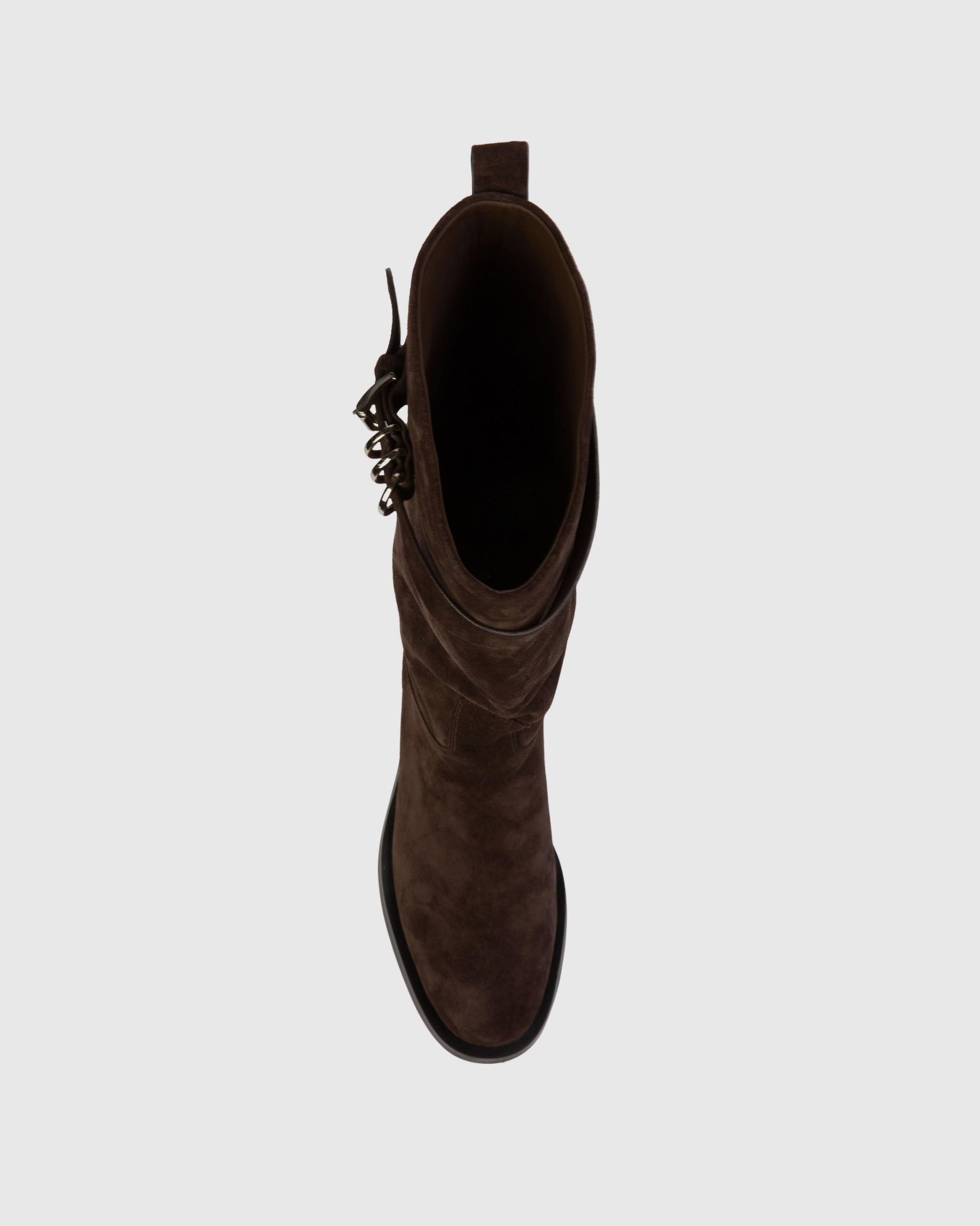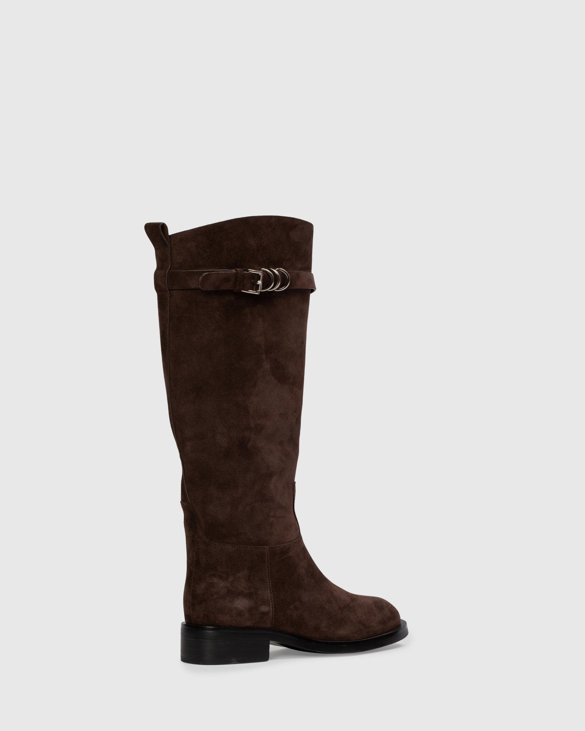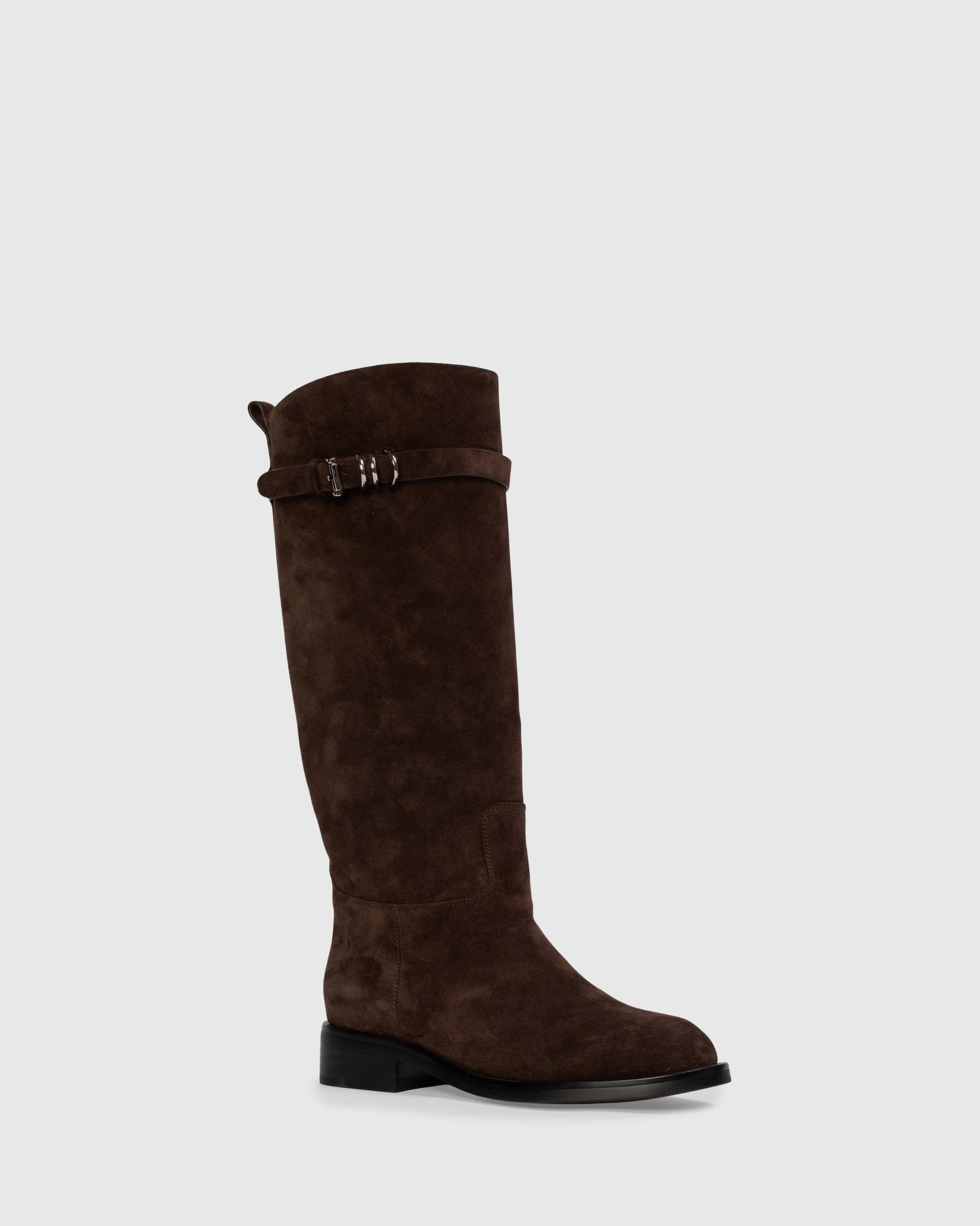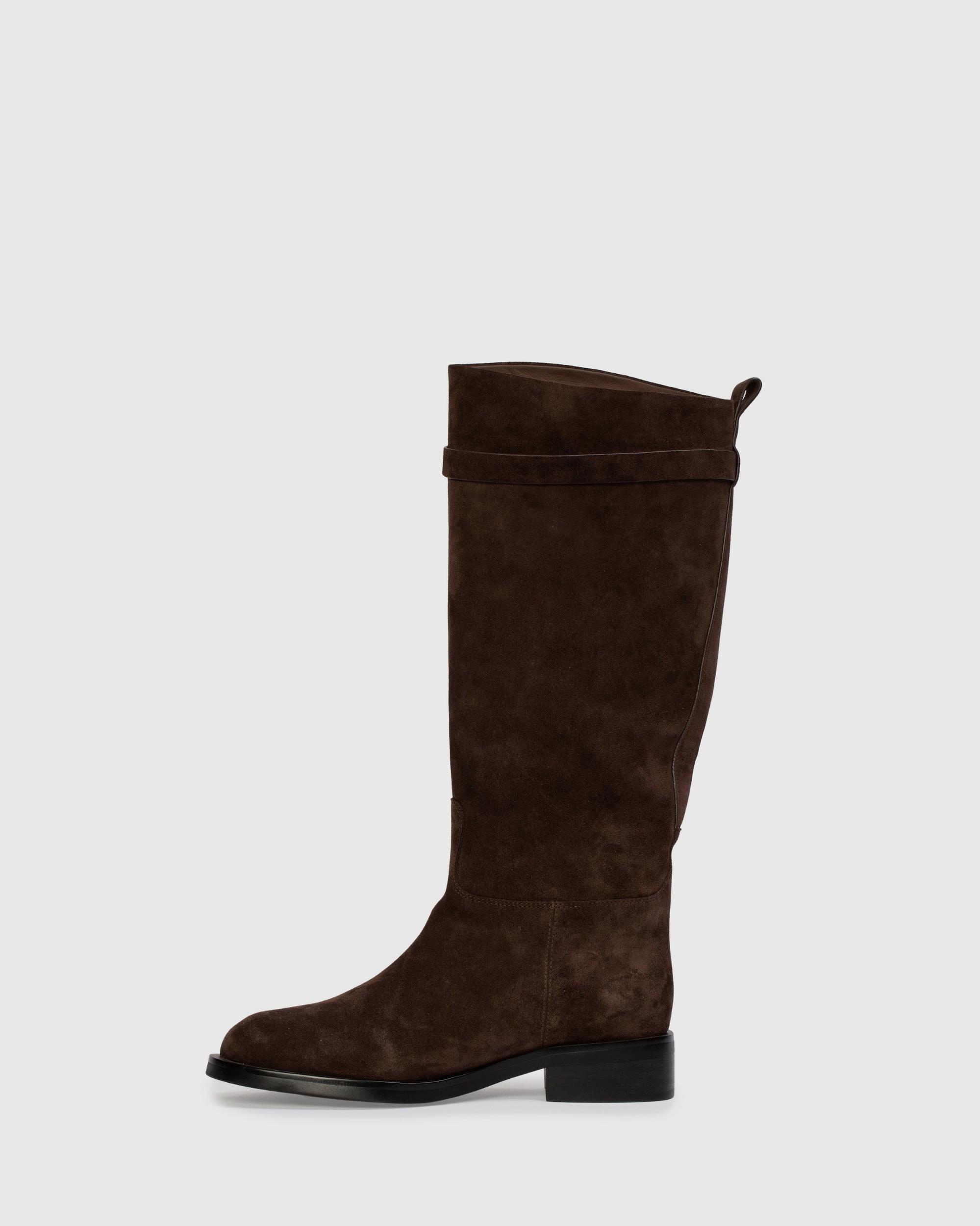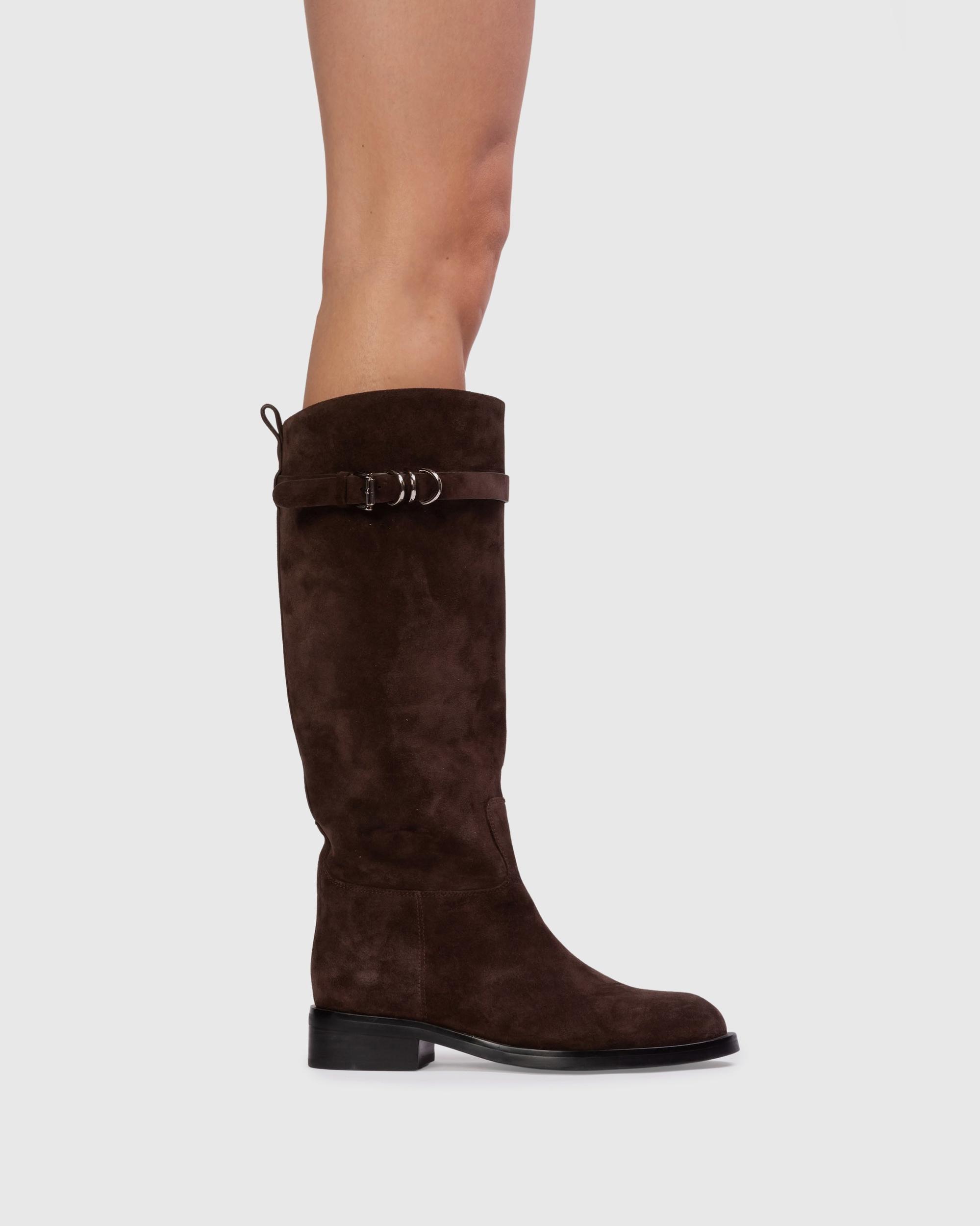 Below the knee classic rider boot with an upper strap with buckle detail. Made with brushed calf suede.