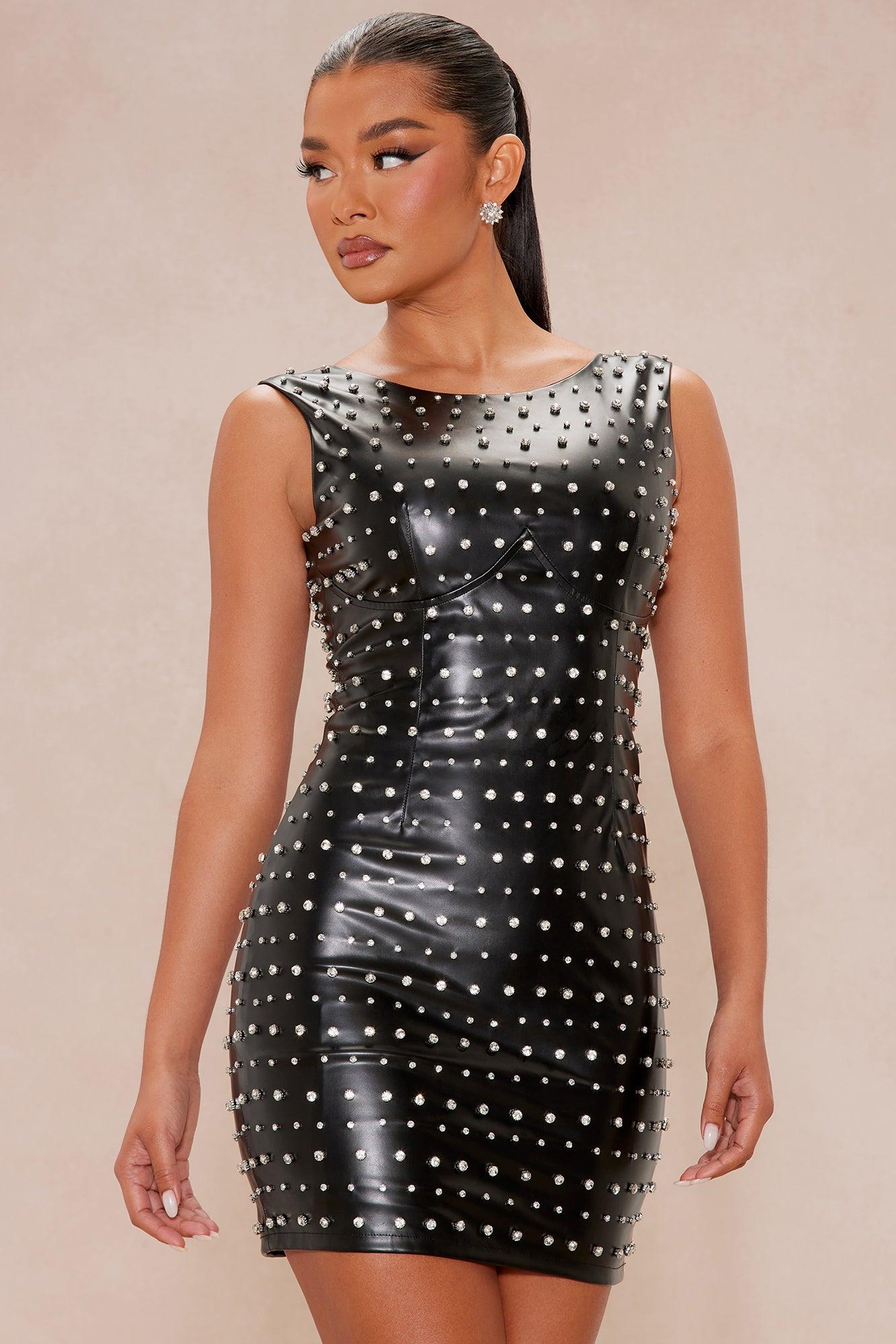 Available In Black And White. Faux Leather Mini Dress Embellished Scoop Neck Center Back Zipper Lined Slight Stretch Self Backing/Lining: 100% Polyester Coating: 100% Polyurethane Imported California Proposition 65 WARNING: Cancer and Reproductive Harm - www.P65Warnings.ca.gov.