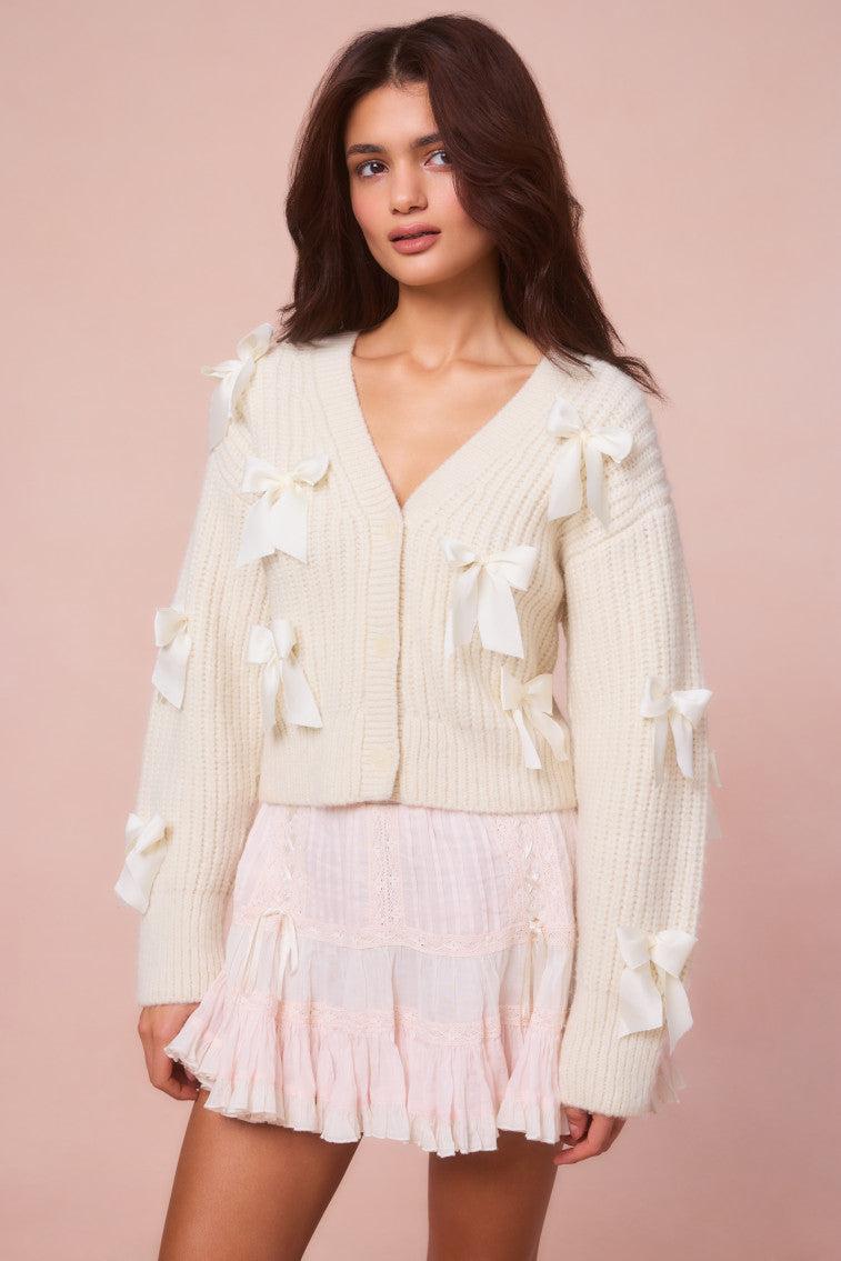 Better with a bow in the Ashtan Cardigan. Knit in Peru, this pretty sweater is designed from a warm alpaca blend for a cozy look and feel. The must-have cardigan features charmeuse bows thoughtfully placed all over for the LoveShackFancy touch. Faux shell LoveShackFancy buttons Full length sleeves