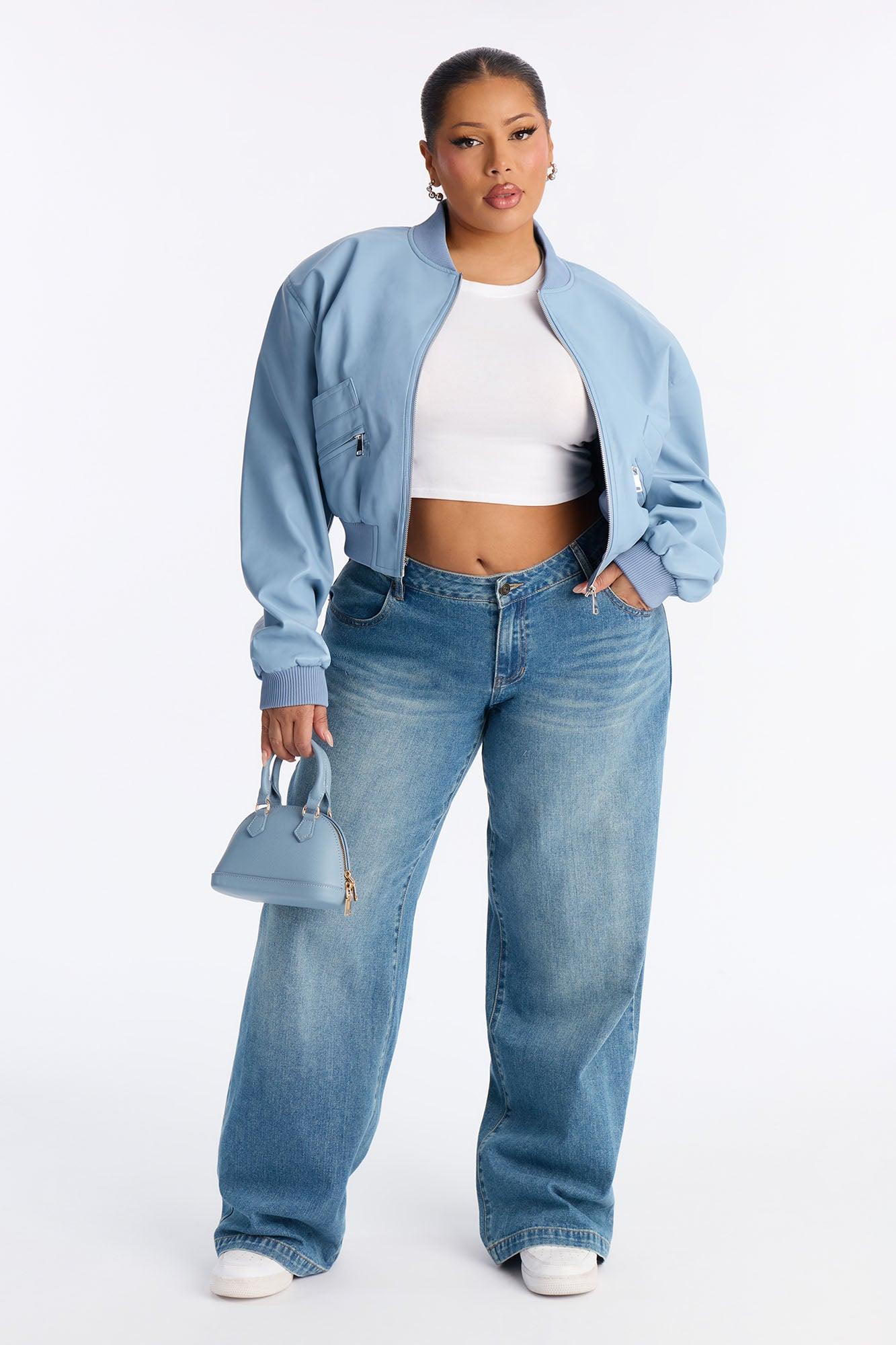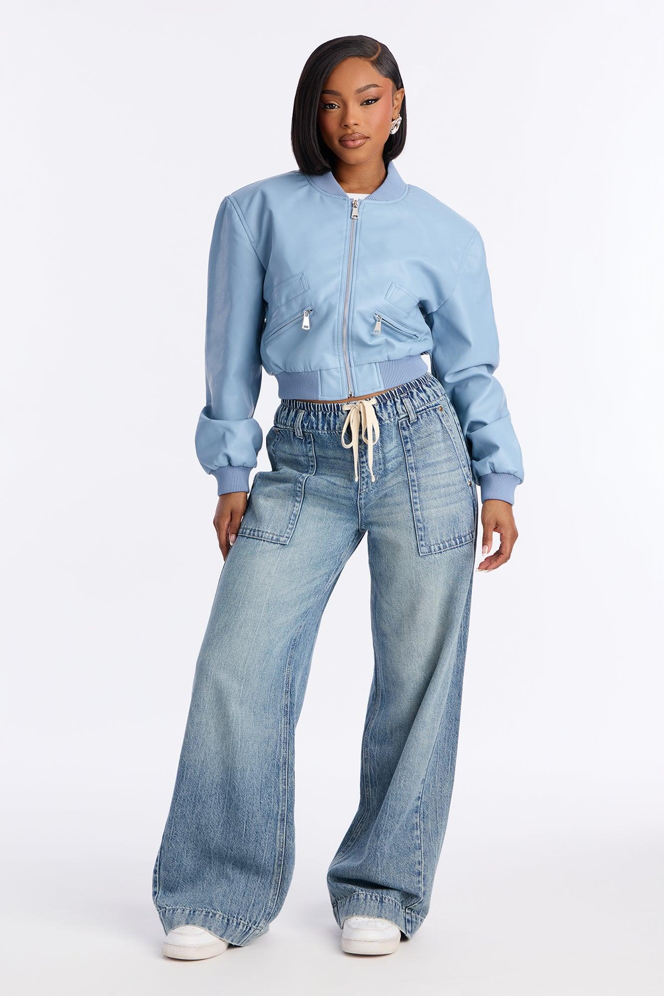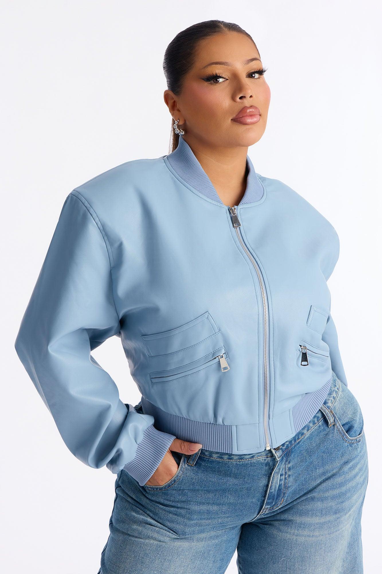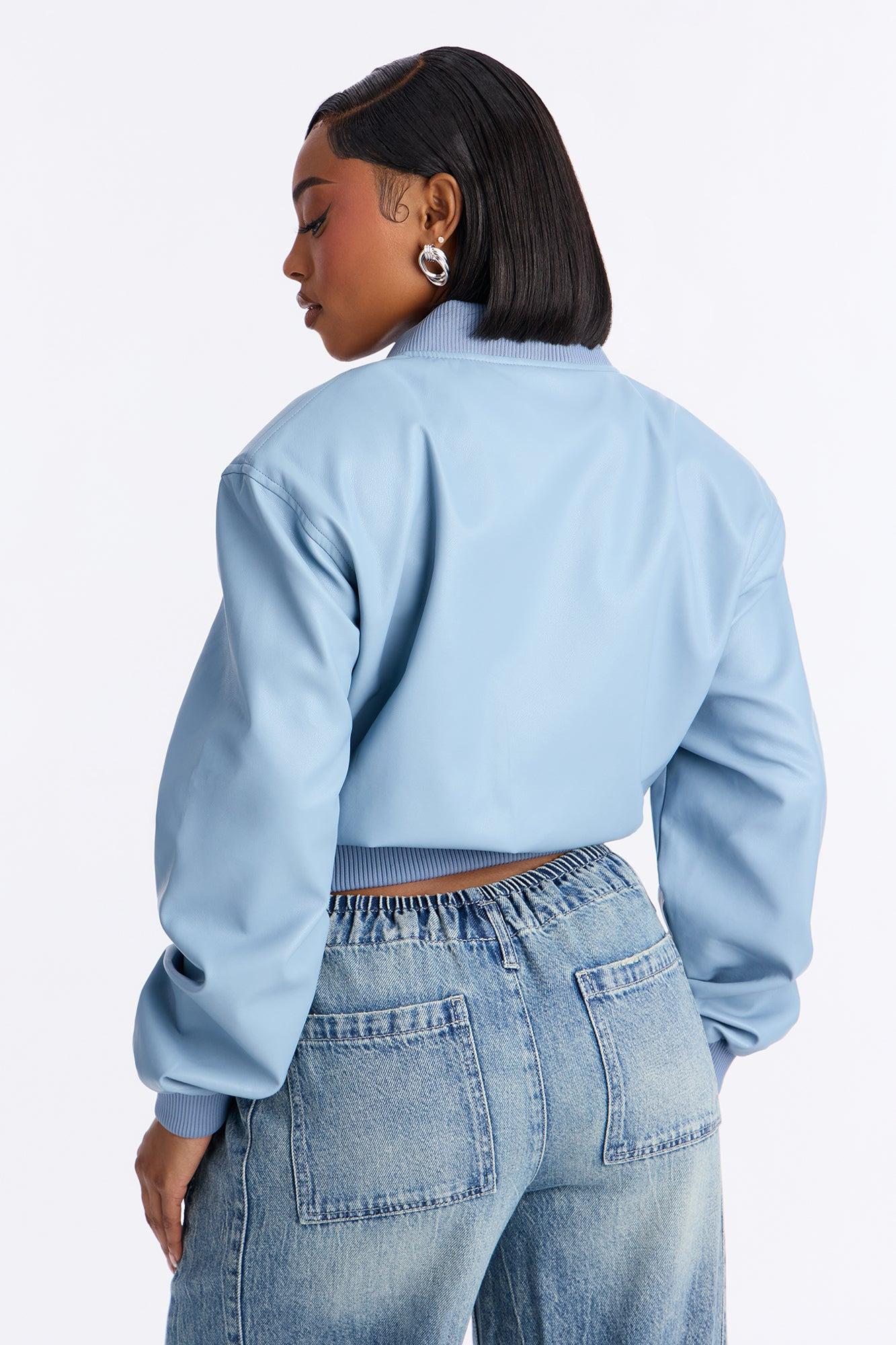 Ashton Faux Leather Shoulder Pad Bomber Jacket - SkyBlue Female
