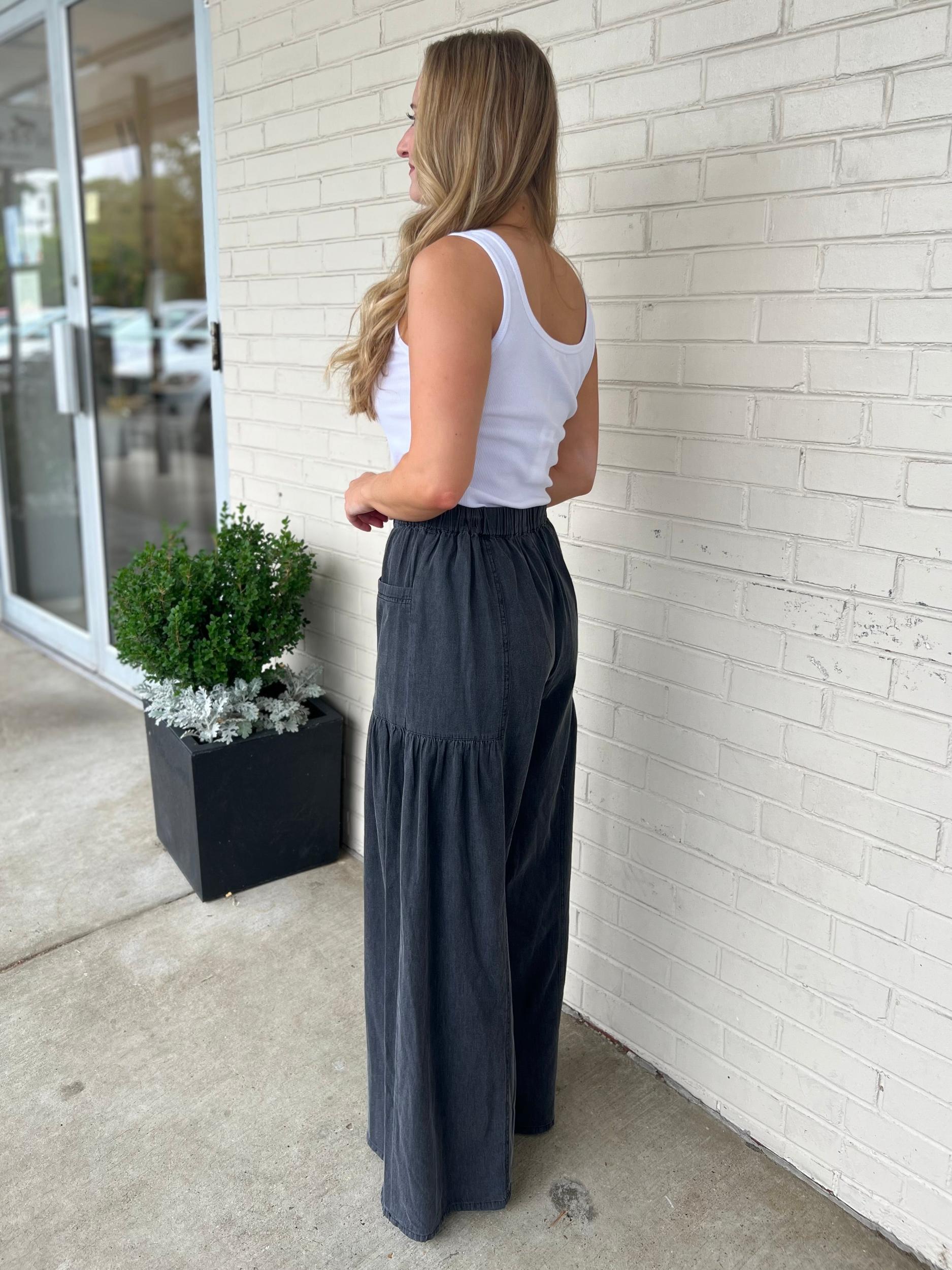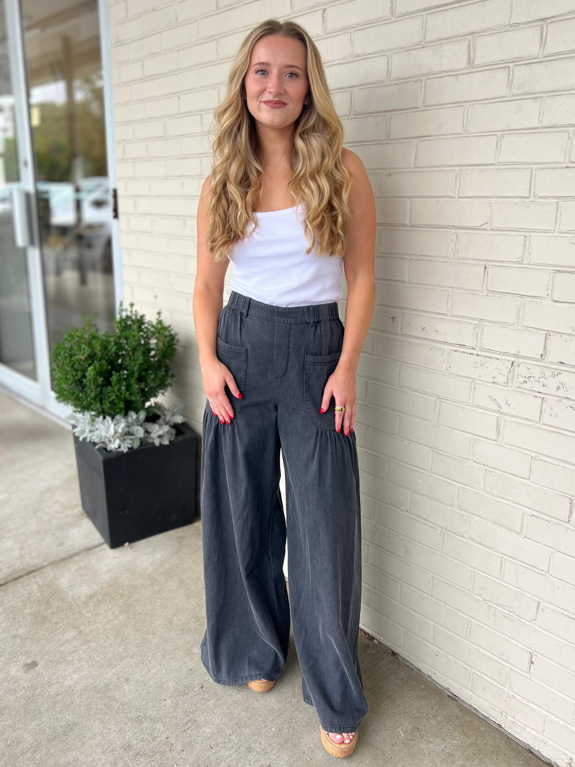 These Ashton Pants bring fun to your wardrobe with their elastic high waist and wide balloon legs that move with you. The washed black fabric adds a cool, lived-in vibe, while front cargo pockets keep your essentials close and your style on point. Perfect for playful days and relaxed adventures!