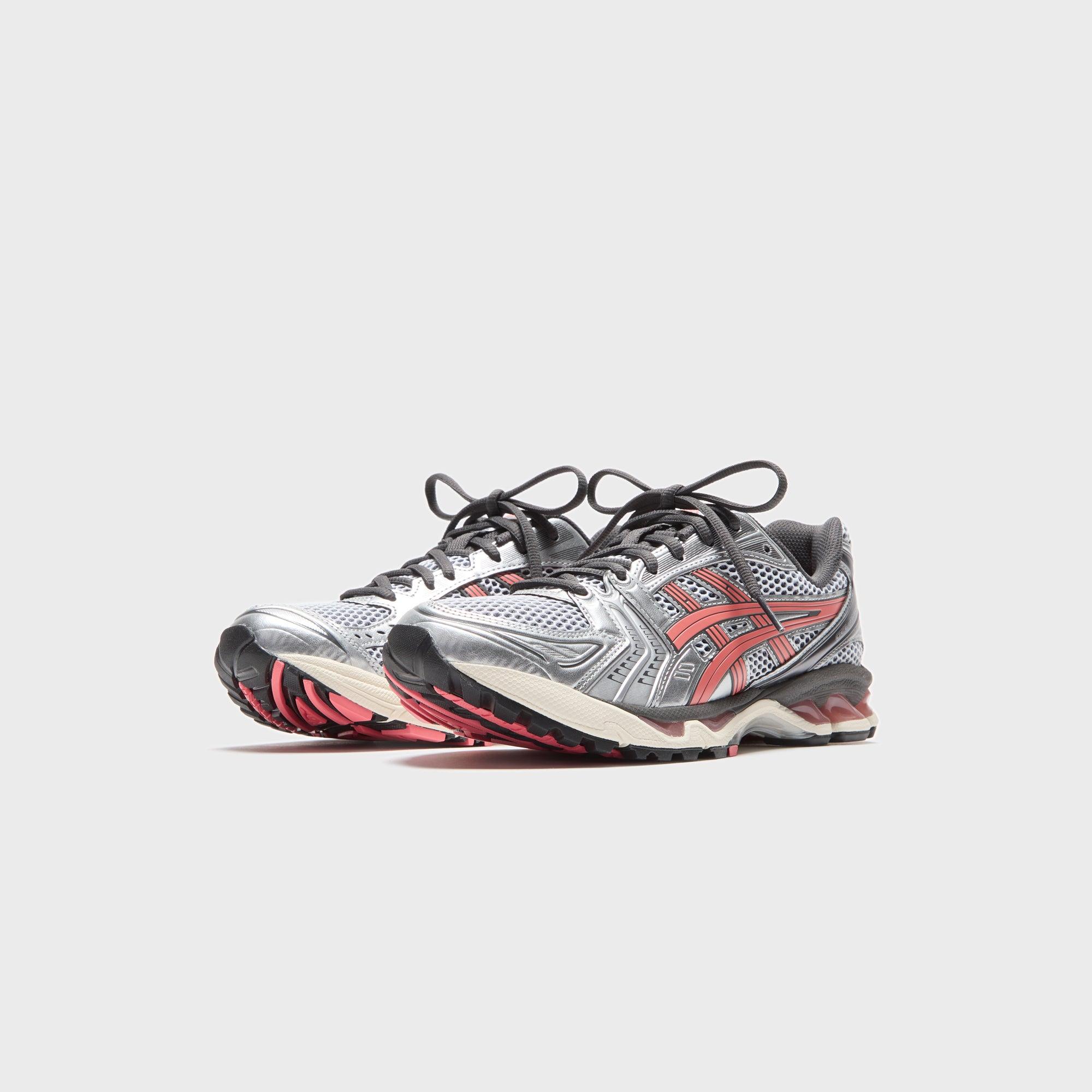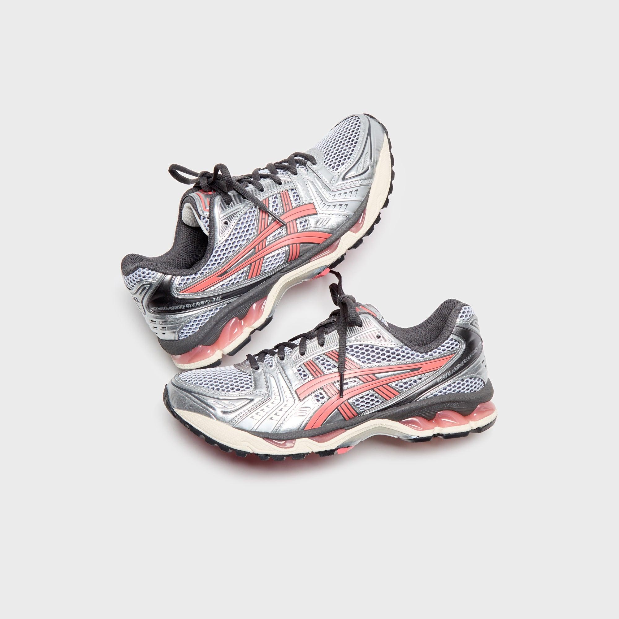 Gel-Kayano 14 silhouette Mesh upper Synthetic leather overlays Formstripe on side panels ASICS logo patch on tongue Cotton laces Branding on side panel Gel-injected rubber midsole Rubber outsole Style: ai1203a740-101 Color: White / Papaya Material: Mesh / Synthetic